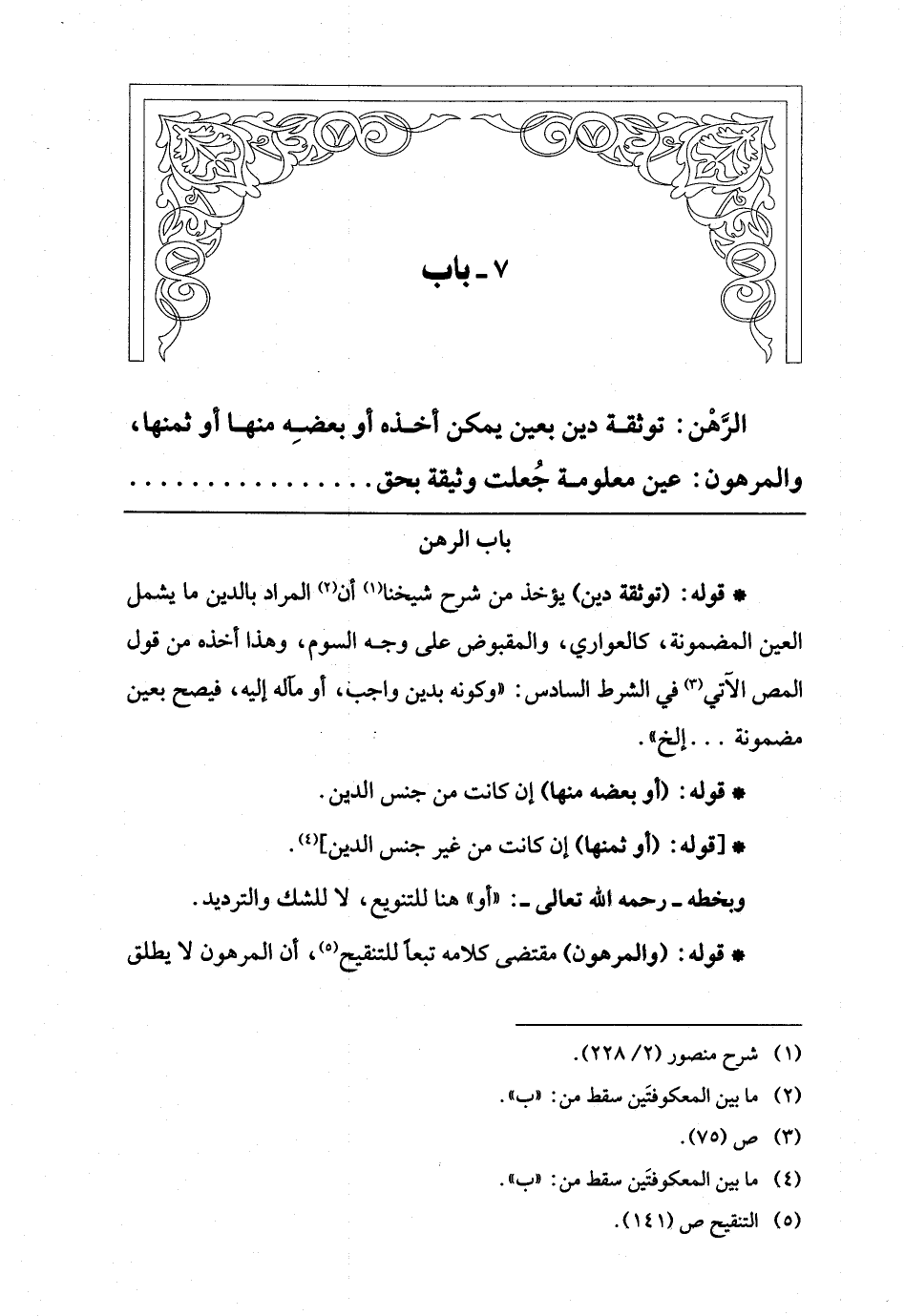 الرَّهْن: توثقة دين بعين يمكن أخذه أو بعضِه منها أو ثمنها، والمرهون: عين معلومة جُعلت وثيقة بحق. . . . . .