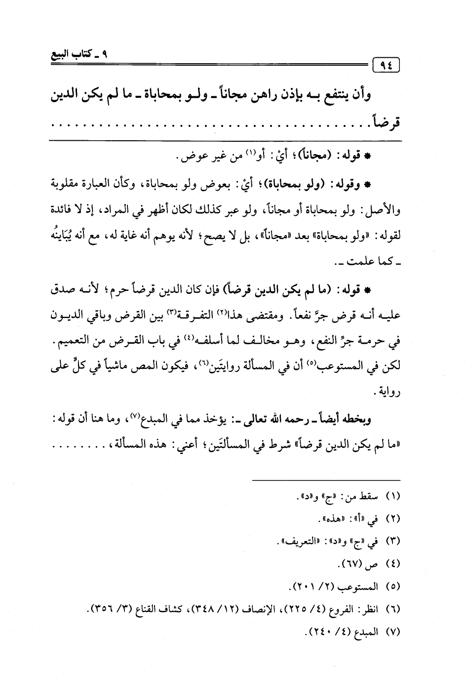 وبخطه أيضًا -رحمه اللَّه تعالى-: يؤخذ مما في المبدع (¬7)، وما هنا أن قوله: "ما لم يكن الدين قرضًا" شرط في المسألتَين؛ أعني: هذه المسألة،. . . . . .