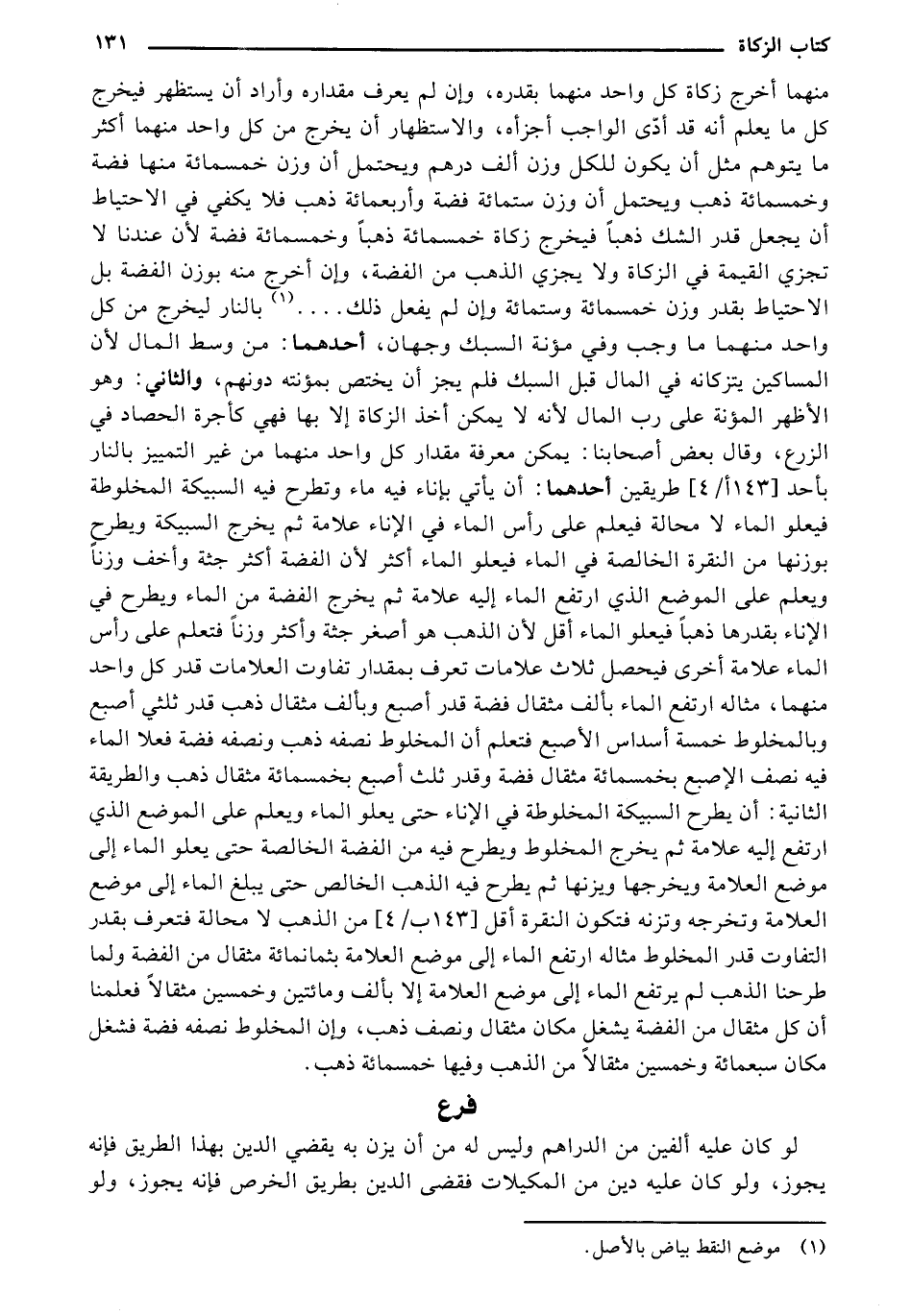 منهما أخرج زكاة كل واحد منهما بقدره، وإن لم يعرف مقداره وأراد أن يستظهر فيخرج كل ما يعلم أنه قد أدّى الواجب أجزأه، والاستظهار أن يخرج من كل واحد منهما أكثر ما يتوهم مثل أن يكون للكل وزن ألف درهم ويحتمل أن وزن خمسمائة منها فضة وخمسمائة ذهب ويحتمل أن وزن ستمائة فضة وأربعمائة ذهب فلا يكفي في الاحتياط أن يجعل قدر الشك ذهبًا فيخرج زكاة خمسمائة ذهبًا وخمسمائة فضة لأن عندنا لا تجزي القيمة في الزكاة ولا يجزي الذهب من الفضة، وان أخرج منه بوزن الفضة بل الاحتياط بقدر وزن خمسمائة وستمائة وإن لم يفعل ذلك .... (¬1) بالنار ليخرج من كل واحد منهما ما وجب وفي مؤنة السبك وجهان، إحداهما: من وسط المال لأن المساكين يتزكانه في المال قبل السبك فلم يجز أن يختص بمؤنته دونهم، والثاني: وهو الأظهر المؤنة على رب المال لأنه لا يمكن أخذ الزكاة إلا بها فهي كأجرة الحصاد في الزرع، وقال بعض أصحابنا: يمكن معرفة مقدار كل واحد منهما من غير التمييز بالنار بأحد [143 أ/ب] طريقين إحداهما: أن يأتي بإناء فيه ماء وتطرح فيه السبيكة المخلوطة فيعلو الماء لا محالة فيعلم على رأس الماء في الإناء علامة ثم يخرج السبيكة ويطرح بوزنها من النقرة الخالصة في الماء فيعلو الماء أكثر لأن الفضة أكثر جثة وأخف وزنًا ويعلم على الموضع الذي ارتفع الماء إليه علامة نم يخرج الفضة من الماء ويطرح في الإناء بقدرها ذهبًا فيعلو الماء أقل لأن الذهب هو أصغر جثة وأكثر وزنًا فتعلم على رأس الماء علامة أخرى فيحصل ثلاث علامات تعرف بمقدار تفاوت العلامات قدر كل واحد منهما، مثاله ارتفع الماء بألف مثقال فضة قدر أصح وبألف مثقال ذهب قدر ثلثي أصبع وبالمخلوط خمسة أسداس الأصبع فتعلم أن المخلوط نصفه ذهب ونصفه فضة فعلا الماء فيه نصف الإصبع بخمسمائة مثقال فضة وقدر ثلث أصبع بخمسمائة مثقال ذهب والطريقة الثانية: أن يطرح السبيكة المخلوطة في الإناء حتى يعلو الماء ويعلم على الموضع الذي ارتفع إليه علامة ثم يخرج المخلوط ويطرح فيه من الفضة الخالصة حتى يعلو الماء إلى موضع العلامة ويخرجها ويزنها نم يطرح فيه الذهب الخالص حتى يبلغ الماء إلى موضع العلامة وتخرجه وتزنه فتكون النقرة أقل [143 ب/ (4)] من الذهب لا محالة فتعرف بقدر التفاوت قدر المخلوط مثاله ارتفع الماء إلى موضع العلامة بثمانمائة مثقال من الفضة ولما طرحنا الذهب لم يرتفع الماء إلى موضع العلامة إلا بألف ومائتين وخمسين مثقالًا فعلمنا أن كل مثقال من الفضة يشغل مكان مثقال ونصف ذهب، وان المخلوط نصفه فضة فشغل مكان سبعمائة وخمسين مثقالًا من الذهب وفيها خمسمائة ذهب.