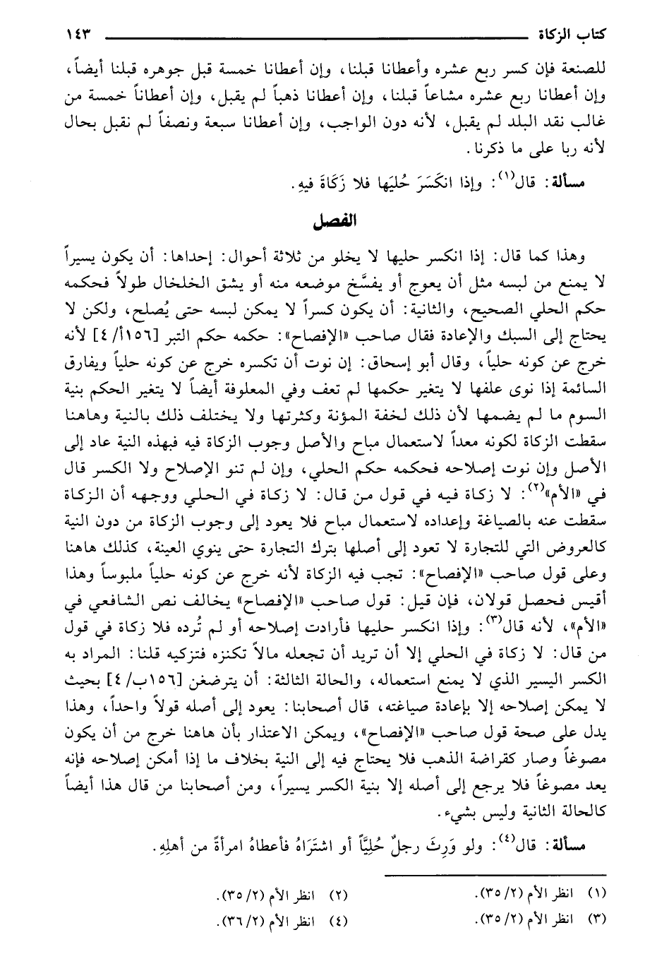 وهذا كما قال: إذا انكسر حليها لا يخلو من ثلاثةً أحوال: إحداها: أن يكون يسيرًا لا يمنع من لبسه مثل أن يعوج أو يفسخ موضعه منه أو يشق الخلخال طولًا فحكمه حكم الحلي الصحيح، والثانية: أن يكون كسرًا لا يمكن لبسه حتى يصلح، ولكن لا يحتاج إلى السبك والإعادةً فقال صاحب "الإفصاح": حكمه حكم التبر [165 أ/ 4] لأنه خرج عن كونه حليًا، وقال أبو إسحاق: إن نوت أن تكسره خرج عن كونه حليًا ويفارق السائمة إذا نوى علفها لا يتغير حكمها لم تعف وفي المعلوفةُ أيضًا لا يتغير الحكم بنية السوم ما لم يضمها لأن ذلك لخفةَ المؤنةً وكثرتها، ولا يختلف ذلك بالنيةً وهاهنا سقطت الزكاة لكونه معدا لاستعمال مباح، والأصل وجوب الزكاةَ فيه فبهذه النيةً عاد إلى الأصل وإن نوت إصلاحه فحكمه حكم الحلي، وإن لم تنو الإصلاح ولا الكسر قال في "الأم" (¬2): لا زكاة فيه في قول من قال: لا زكاة في الحلي ووجهه أن الزكاةً سقطت عنه بالصياغةً وإعداد، لاستعمال مباح فلا يعود إلى وجوب الزكاةً عن دون النيةً كالعروض التي للتجارةً لا تعود إلى أصلها بترك التجارةً حتى ينوي العينةً، كذلك هاهنا وعلى قول صاحب "الإفصاح": تجب فيه الزكاةً لأنه خرج عن كونه حليًا ملبوسًا وهذا أقيس فحصل قولان: فإن قيل: قول صاحب "الإفصاح" يخالف نص الشافعي في "الأم"؛ لأنه قال (¬3): وإذا انكسر حليها فأرادت إصلاحه أو لم ترده فلا زكاةً في قول من قال: لا زكاةً في الحلي إلا أن تريد أن تجعله مالًا تكنزه فتزكيه قلنا: المراد به الكسر اليسير الذي لا يمنع استعماله، والحالة الثالثة: أن يترضغن [(156) ب/4] بحيث لا يمكن إصلاحه إلا بإعادةُ صياغته، قال أصحابنا: يعود إلى أصله قولًا واحدًا، وهذا يدل على صحةُ قول صاحب "الإفصاح" ويمكن الاعتذار بأن هاهنا خرج من أن يكون مصوغًا وصار كقراضةَ الذهب فلا يحتاج فيه إلى النيةُ بخلاف ما إذا أمكن إصلاحه فإنه يعد مصوغًا فلا يرجع إلى أصله إلا بنية الكسر يسيرًا، ومن أصحابنا من قال هذا أيضًا كالحالة الثانية وليس بشيء.