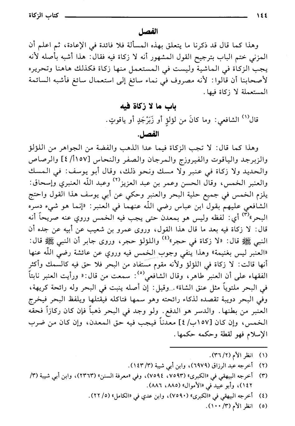 وهذا كما قال: لا تجب الزكاةَ فيما عدا الذهب والفضةً من الجواهر من اللؤلؤ والزبرجد والياقوت والفيروزج والمرجان والصفر والنحاس [157 أ/ 4] والرصاص والحديد ولا زكاةً في عنبر ولا مسك ونحو ذلك، وقال أبو يوسف: في المسك والعنبر الخمس، وقال الحسن وعمر بن عبد العزيز (¬2) وعبد الله العنبري وإسحاق: يلزم الخمس في جميع حليةُ البحر والعنبر وحكي عن أبي يوسف هذا القول واحتج الشافعي عليهم يقول ابن عباس - رضي الله عنهما- في العنبر: "إنما هو شيء دسره البحر" (¬3) أي لفظه وليس هو بمعدن حتى يجب فيه الخمس وروي عنه صريحًا أنه قال: لا زكاةً فيه بعد ما قال هذا القول، وروى عمرو بن شعيب عن أبيه عن جده أن النبي - صلى الله عليه وسلم - قال: "لا زكاةً في حجر" (¬4) واللؤلؤ حجر، وروى جابر أن النبي - صلى الله عليه وسلم - قال: "العنبر ليس بغنيمةً" وهذا ينفي وجوب الخمس فيه وروي عن عائشةً -رضي الله عنها- أنها قالت: لا زكاةً في اللؤلؤ ولأنه مقوم مستفاد من البحر فلا حق فيه كالمسك وأكثر الفقهاء على أن العنبر طاهر، وقال الشافعي (¬5): سمعت من قال: " ورأيت العنبر نابتًا في البحر ملتويًا مثل عنق الشاة". وقيل: إن أصله ينبت في البحر وله رائحة كريهةً، وفي البحر دويبةً تقصده لذكاء رائحته وهو سمها فتأكله فيقتلها ويلفظ البحر فيخرج العنبر من بطنها، والدسر هو الدفع، ولو وجد في البحر ذهبًا فإن كان ركازاً فحقه الخمس، وإن كان [157 ب/ (4)] معدنًا فيجب فيه حق المعدن، وإن كان من ضرب الإسلام فهو لقطةً وحكمه حكمها.