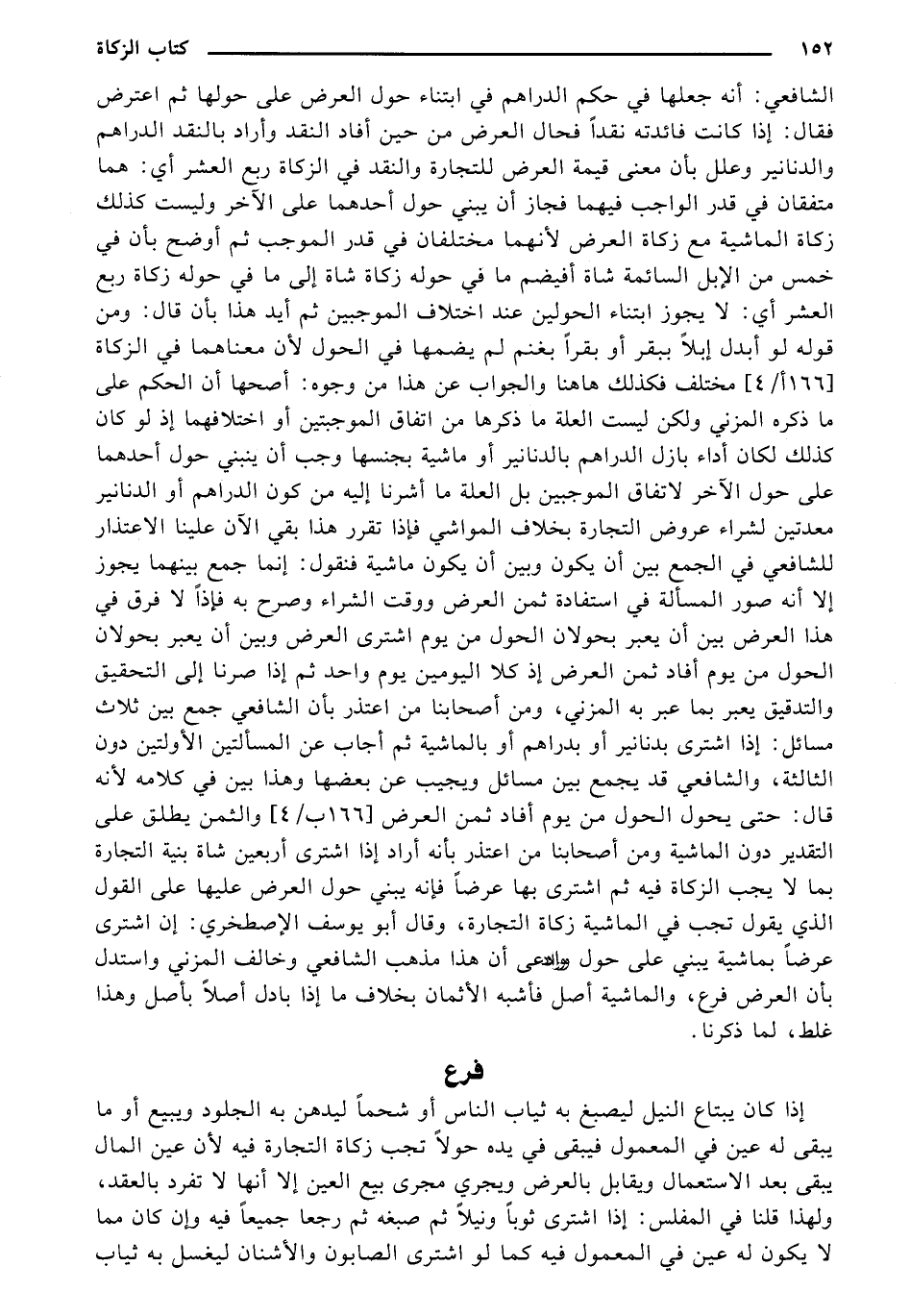 الشافعي: أنه جعلها في حكم الدراهم في ابتناء حول العرض على حولها ثم اعترض فقال: إذا كانت فائدته نقدًا فحال العرض من حين أفاد النقد وأراد بالنقد الدراهم والدنانير وعلل بأن معنى قيمةَ العرض للتجارةً والنقد في الزكاةً ربع العشر أي: هما متفقان في قدر الواجب فيهما فجاز أن يبنى حول أحدهما على الآخر وليست كذلك زكاةُ الماشيةَ مع زكاةَ العرض لأنهما مختلفان في قدر الموجب ثم أوضح بأن في خمس من الإبل السائمةً شاةُ أفيضم ما في حوله زكاةً شاةً إلى ما في حوله زكاة ربع العشر أي: لا يجوز ابتناء الحولين عند اختلاف الموجبين ثم أيد هذا بأن قال: ومن قوله لو أبدل إبلًا ببقر أو بقراً بغنم لم يضمها في الحول لأن معناهما في الزكاة [166 أ/ 4] مختلف فكذلك هاهنا والجواب عن هذا من وجوه: أصحها أن الحكم على ما ذكره المزني ولكن ليست العلةُ ما ذكرها من اتفاق الموجبتين أو اختلافهما إذ لو كان كذلك لكان أداء بازل الدراهم بالدنانير أو ماشيةُ بجنسها وجب أن ينبني حول أحدهما على حول الآخر لاتفاق الموجبين بل العلةً ما أشرنا إليه من كون الدراهم أو الدنانير معدتين لشراء عروض التجارةً بخلاف المواشي فإذا تقرر هذا بقي الآن علينا الاعتذار للشافعي في الجمع بين أن يكون وبين أن يكون ماشيةً فنقول: إنما جمع بينهما يجوز إلا أنه صور المسألةً في استفادةً ثمن العرض ووقت الشراء وصرح به فإذًا لا فرق في هذا العرض بين أن يعبر بحولان الحول من يوم اشترى العرض وبين أن يعبر بحولان الحول من يوم أفاد ثمن العرض إذ كلا اليومين يوم واحد ثم إذا صرنا إلى التحقيق والتدقيق يعبر بما عبر به المزني، ومن أصحابنا من اعتذر بأن الشافعي جمع بين ثلاث مسائل: إذا اشترى بدنانير أو بدراهم أو بالماشيةً ثم أجاب عن المسألتين الأولتين دون الثالثةً، والشافعي قد يجمع بين مسائل ويجيب عن بعضها وهذا بين في كلامه لأنه قال: حتى يحول الحول من يوم أفاد ثمن العرض [166 ب/ 4] والثمن يطلق على التقدير دون الماشيةً ومن أصحابنا من اعتذر بأنه أراد إذا اشترى أربعين شاةً بنيةَ التجارةُ بما لا يجب الزكاةً فيه ثم اشترى بها عرضًا فإنه يبني حول العرض عليها على القول الذي يقول تجب في الماشيةُ زكاةُ التجارةً، وقال أبو يوسف الإصطخري: إن اشترى عرضًا بماشيةً يبني على حول وادعي أن هذا مذهب الشافعي وخالف المزني واستدل بأن العرض فرع، والماشيةً أصل فأشبه الأثمان بخلاف ما إذا بادل أصلًا بأصل وهذا غلط، لما ذكرنا.