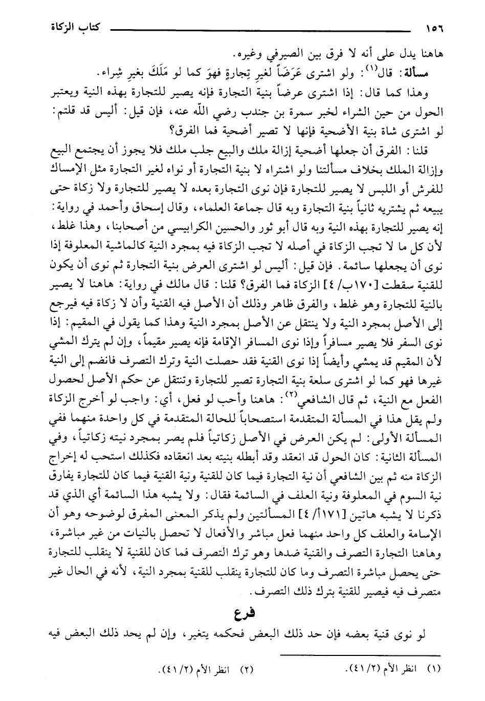 وهذا كما قال: إذا اشترى عرضًا بنيةَ التجارةً فإنه يصير للتجارةً بهذه النية ويعتبر الحول من حين الشراء لخبر سمرةً بن جندب رضي الله عنه، فإن قيل: أليس قد قلتم: لو اشترى شاةً بنية الأضحيةً فإنها لا تصير أضحيةً فما الفرق؟ قلنا: الفرق أن جعلها أضحيةً إزالةُ ملك والبيع جلب ملك فلا يجوز أن يجتمع البيع وإزالةً الملك بخلاف مسألتنا ولو اشتراه لا بنيةَ التجارةً أو نواه لغير التجارة مثل الإمساك للفرش أو اللبس لا يصير للتجارةً فإن نوى التجارةً بعده لا يصير للتجارةً ولا زكاةً حتى يبيعه ثم يشتريه ثانيًا بنيةَ التجارةً وبه قال جماعةُ العلماء، وقال إسحاق وأحمد في روايةً: إنه يصير للتجارةً بهذه النية وبه قال أبو ثور والحسين الكرابيسي من أصحابنا، وهذا غلط؛ لأن كل ما لا تجب الزكاةً في أصله لا تجب الزكاةً فيه بمجرد النية كالماشيةً المعلوفةً إذا نوى أن يجعلها سائمةً. فإن قيل: أليس لو اشترى العرض بنيةَ التجارةً ثم نوى آن يكون للقنيةً سقطت [170 ب/ (4)] الزكاةً فما الفرق؟ قلنا: قال مالك في رواية: هاهنا لا يصير باليةَ للتجارةً وهو غلط، والفرق ظاهر؛ وذلك أن الأصل فيه الفنية وأن لا زكاةً فيه فيرجع إلى الأصل بمجرد النيةَ ولا ينتقل عن الأصل بمجرد النيةَ وهذا كما يقول في المقيم؛ إذا نوى السفر فلا يصير مسافرًا وإذا نوى المسافر الإقامةً فإنه يصير مقيمًا، وإن لم يترك المشي لأن المقيم قد يمشي وأيضًا إذا نوى القنيةً فقد حصلت النيةَ وترك التصرف فانضم إلى النيةً غيرها فهو كما لو اشترى سلعةً بنية التجارةً تصير للتجارةَ وتنتقل عن حكم الأصل لحصول الفعل مع النية، ثم قال الشافعي (¬2): هاهنا وأحب لو فعل، أي: واجب لو أخرج الزكاةً ولم يقل هذا في المسألةً المقدمة استصحابًا للحالةُ المتقدمةً في كل واحدةً منهما في المسألةَ الأولى: لم يكن العرض في الأصل زكاتياً فلم يصر بمجرد نيته زكاتيًا، وفي المسألة الثانية: كان الحول قد انعقد وقد أبطله بنيته بعد انعقاده فكذلك استحب له إخراج الزكاةً منه ثم بين الشافعي أن نيةَ التجارةً فيما كان للقنية ونيةَ القنيةً فيما كان للتجارةً يفارق نيةُ السوم في المعلوفةً ونية العلف في السائمة فقال: ولا يشبه هذا السائمة أي الذي قد ذكرنا لا يشبه هاتين [171 ب/ (4)] المسألتين ولم يذكر المعنى المفرق لوضوحه وهو أن الإمامةً والعلف كل واحد منهما فعل مباشر والأفعال لا تحصل بالنيات من غير مباشرةً، وهاهنا التجارة التصرف والقنيةً ضدها وهو ترك التصرف فما كان للقنيةَ لا ينقلب للتجارةً حتى يحصل مباشرةً التصرف وما كان للتجارةَ ينقلب للقنية بمجرد النية، لأنه في الحال غير متصرف فيه فيمر للقنيةً بترك ذلك التصرف.