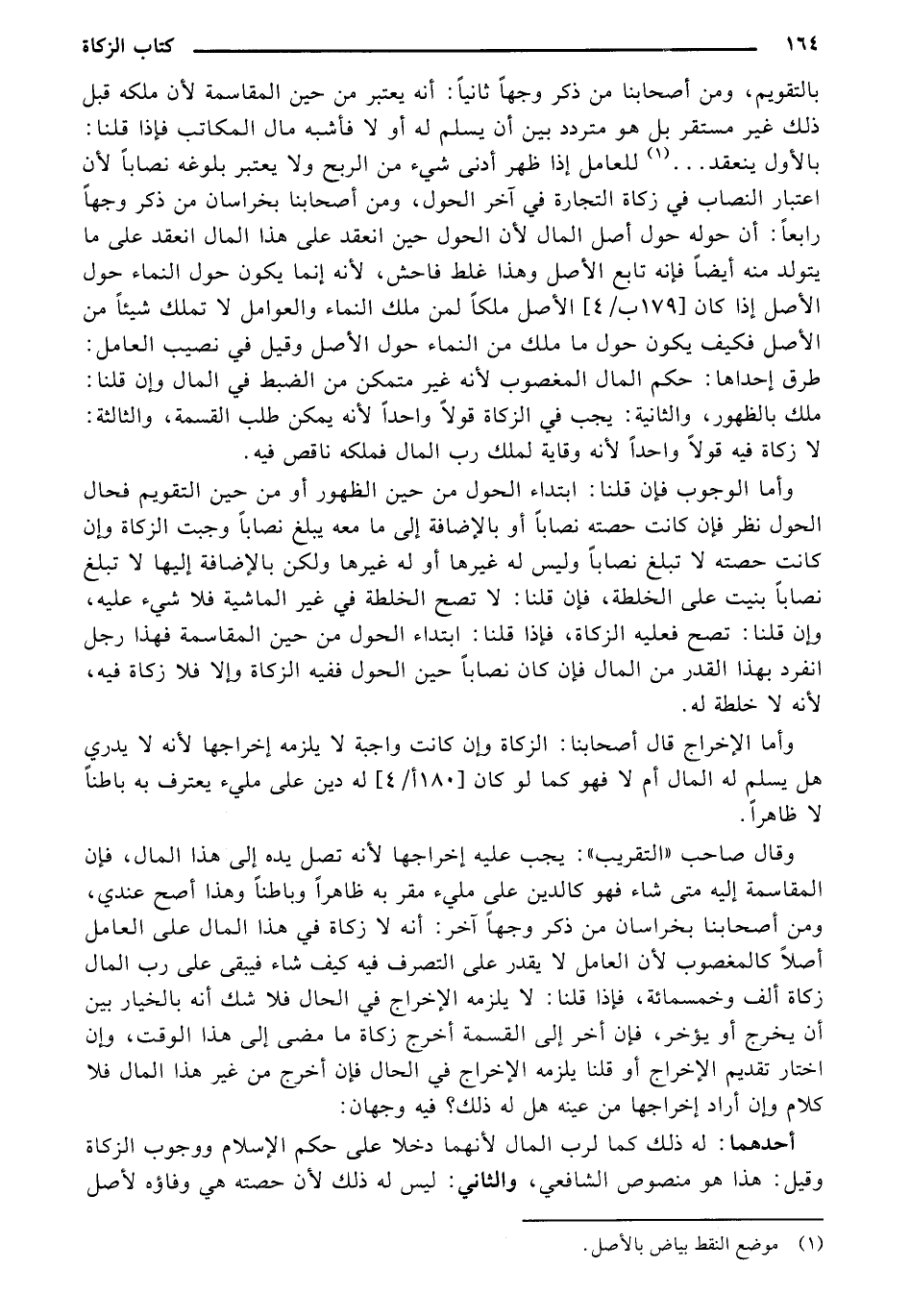 بالتقويم، ومن أصحابنا من ذكر وجهًا ثانيًا: أنه يعتبر من حيث المقاسمة لأن ملكه قبل ذلك غير مستقر بل هو متردد بين أن يسلم له أو لا فأشبه مال المكاتب فإذا قلنا: بالأول ينعقد ... (¬1) للعامل إذا ظهر أدنى شيء من الربح ولا يعتبر بلوغه نصابًا لأن اعتبار النصاب في زكاة التجارة في آخر الحول، ومن أصحابنا بخسران من ذكر وجهًا رابعًا: أن حوله حول أصل المال لأن الحول حين انعقد على هذا المال انعقد على ما يتولد منه أيضًا فإنه تابع الأصل وهذا غلط فاحش، لأنه إنما يكون حول النماء حول الأصل إذا كان [179 ب/4] الأصل ملكًا لمن ملك النماء والعوامل لا تملك شيئًا من الأصل فكيف يكون حول ما ملك من النماء حول الأصل وقيل في نصيب العامل: طرق إحداها: حكم المال المغصوب لأنه غير متمكن من الضبط في المال وإن قلنا: ملك بالظهور، والثانية: يجب في الزكاة قولًا واحدًا لأنه يمكن طلب القسمة، والثالثة: لا زكاة فيه قولًا واحدًا لأنه وقاية لملك رب المال فملكه ناقص فيه.