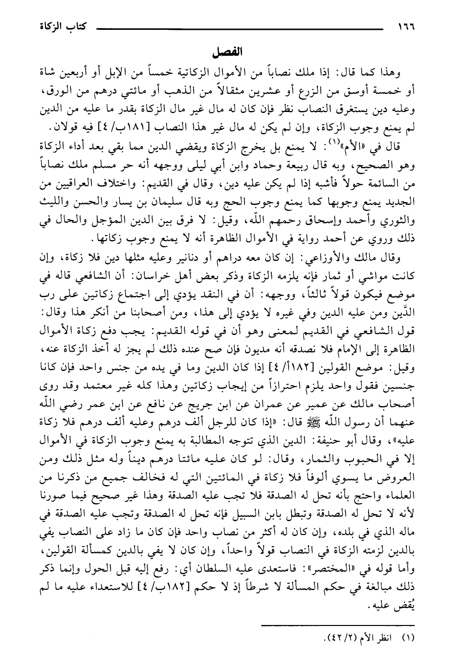 وهذا كما قال: إذا ملك نصابًا من الأموال الزكاتية خمسًا من الإبل أو أربعين شاه أو خمسة أوسق من الزرع أو عشرين مثقالًا من الذهب أو مائتي درهم من الورق، وعليه دين يستغرق النصب نظر فإن كان له مال غير هذا النصاب (181 ب/ 4) فيه قولان.