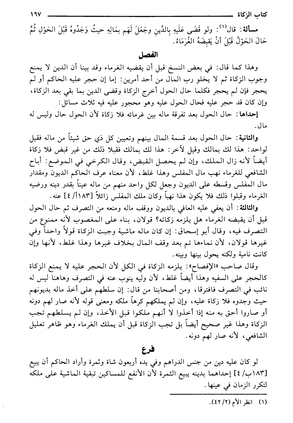 لو كان عليه دين من جنس الدراهم وفي يده أربعون شاه وثمره وأراد الحاكم أن يبيع (183 ب/4) أحداهما بدينه يبيع الثمرة لأن الأنفع للمساكين تبقية الماشية على ملكه لتكرر الزمان في عينها.