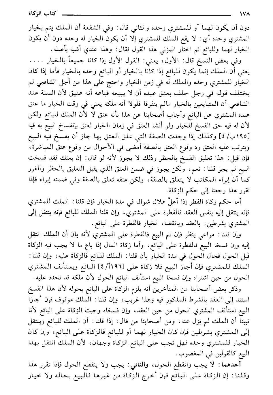 وفي بعض النسخ قال: الأول، يعني: القول الأول إذا كانا جميعًا بالخيار .... يعني أن الملك أنما يكون للبائع إذا كانا بالخيار أو البائع وحده بالخيار فأما إذا كان الخيار للمشتري وحده والملك له في زمن الخيار واحتج على هذا من أجل الشافعي لم يختلف قوله في رجل حلف بعتق عبده أن لا يبيع فباعه أنه عتيق لأن السنة عند الشافعي أن المتبايعين بالخيار ما لم يتفرقا فلولا أنه ملكه يعني في وقت الخيار ما عتق عبده المشتري عل البائع وأجاب أصحابنا عن هذا بأنه عتق لا لأن الملك للبائع ولكن لأن له فيه حق الفسخ للخيار ولو أنشأ العتق في زمان الخيار لعتق بانفساخ البيع به فيه (195 ب/4) وكذلك إذا وجدت الصفة التي علق العتق بها جاز أن يفسخ فيه البيع ويترتب عليه العتق رد وقوع العتق بالصفة أمضى في الأحوال من وقوع عتق المباشرة، فإن قيل: هذا تعليق الفسخ بالحظر وذلك لا يجوز لأنه لو قال: إن بعتك فقد فسخت البيع لم يجز قلنا: نعم، ولكن يجوز في ضمن العتق الذي يقبل التعليق بالحظر والغرر كما أن إبراء المكاتب لا يتعلق بالصفة، ولكن عتقه تعلق بالصفة وفي ضمنه إبراء فإذا تقرر هذا رجعنا إلى حكم الزكاة.