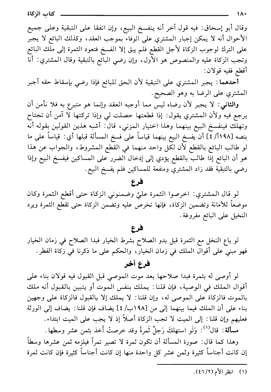 والثاني: لا يجبر لأن رضاه ليس مما أوجبه العقد وإنما هو متبرع به فلا نأمن أن يرجع فيه ولأن المشتري يقول: إذا قطعتها حصلت لي وإذا تركتها لا آمن أن تجتاح وتهلك فينفسخ البيع بينهما وهذا اختيار المزني، قال: أشبه هذين القولين بقوله أنه بنصه [198 أ/ 4] أن يفسخ البيع بينهما قياسًا على فسخ المسألة قبلها: أي قياسًا على ما لو طالب البائع بالقطع لأن الكل واحد منهما في القطع المشروط، والجواب عن هذا هو أن البائع إذا طلب بالقطع يؤدي إلى إدخال الضرر على المساكين فيفسخ البيع وإذا رضي بالتبقية فقد زاد المشتري ومنفعة للمساكين فلم يفسخ البيع.
