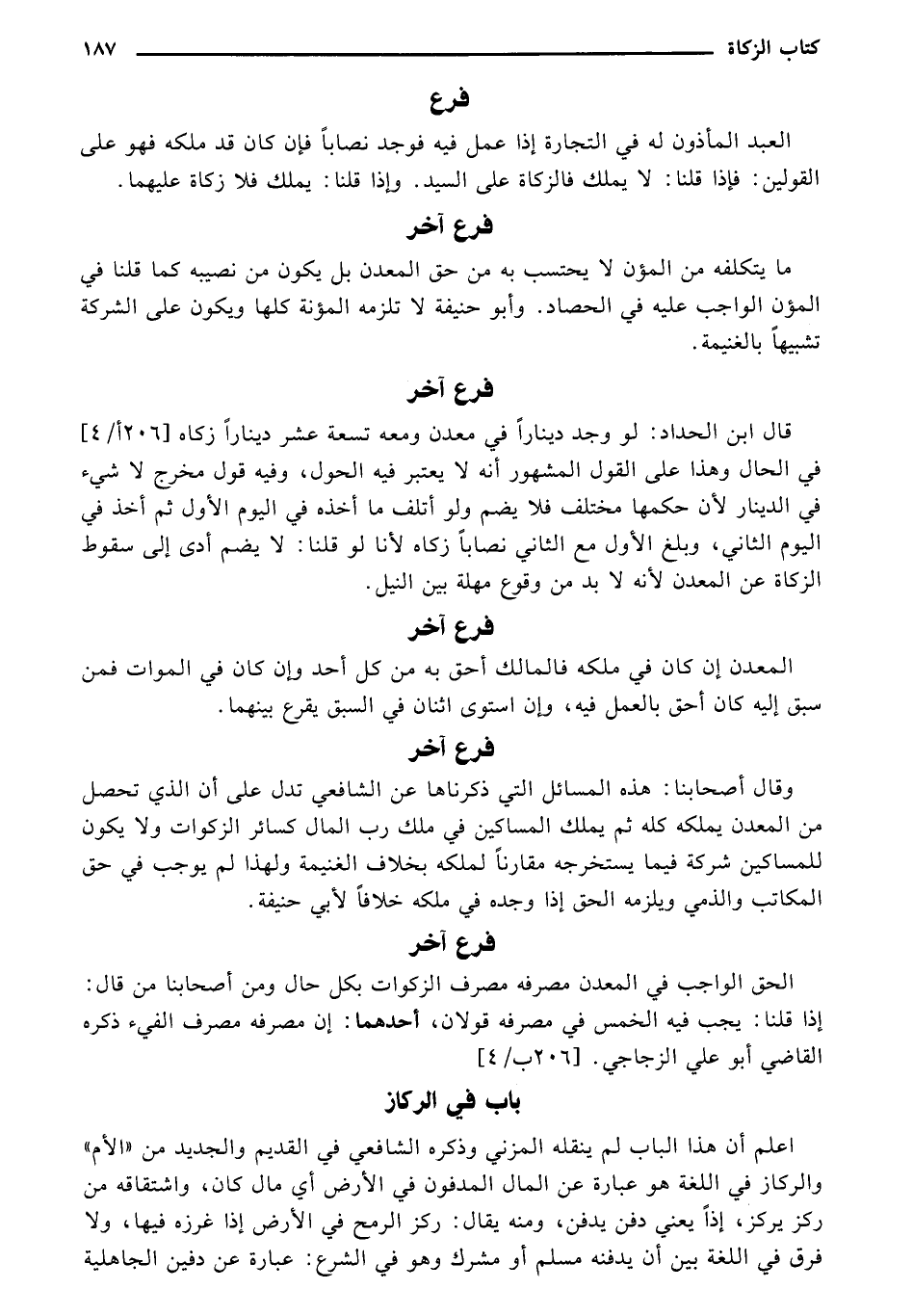 وقال أصحابنا: هذه المسائل التي ذكرناها عن الشافعي تدل على أن الذي تحصل من المعدن يملكه كله ثم يملك المساكين في ملك رب المال كسائر الزكوات ولا يكون للمساكين شركة فيما يستخرجه مقارنًا لملكه بخلاف الغنيمة ولهذا لم يوجب في حق المكاتب والذمي ويلزمه الحق إذا وجده في ملكه خلافًا لأبي حنيفة.