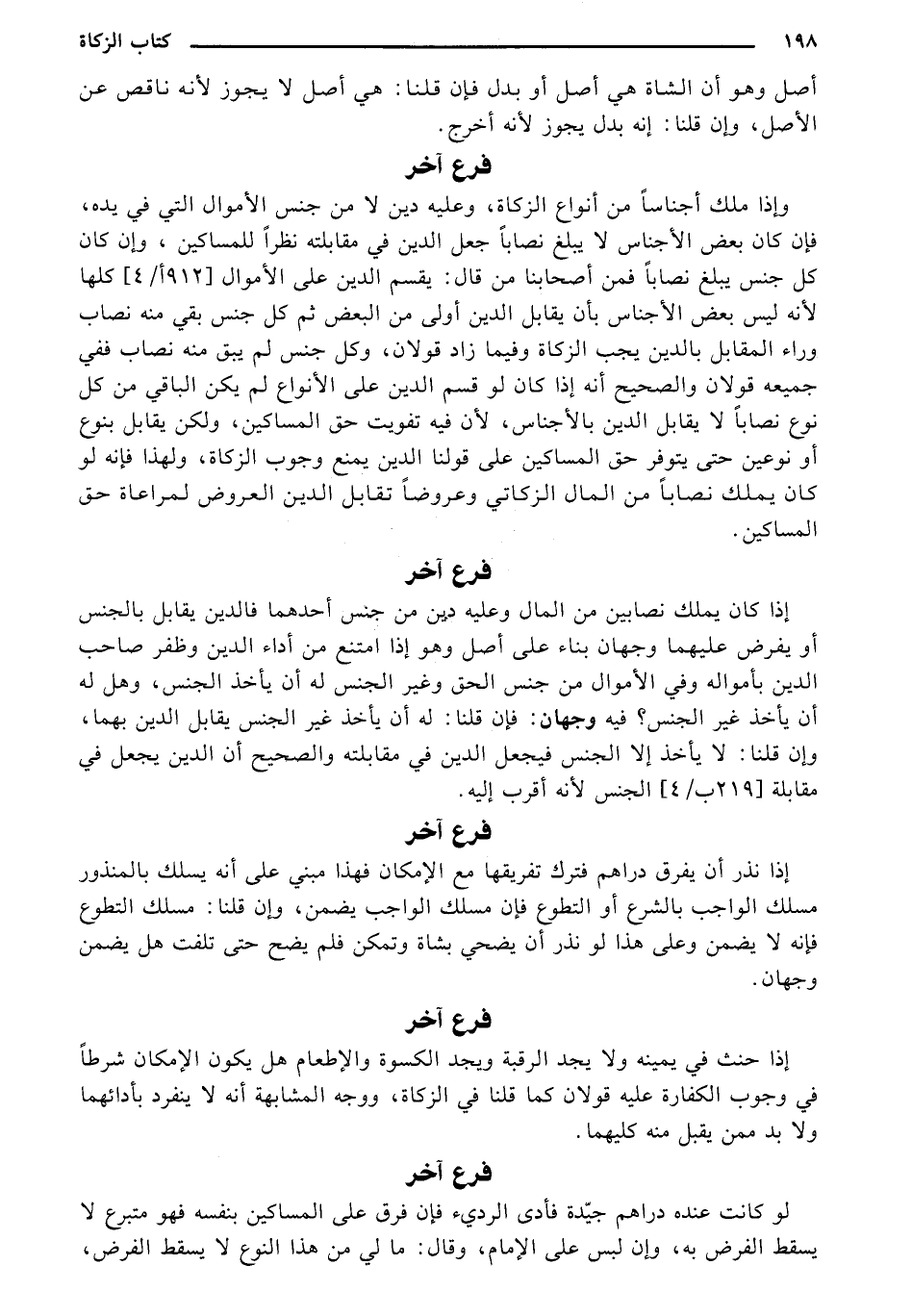 وإذا ملك أجناسًا من أنواع الزكاة، وعليه دين لا من جنس الأموال التي في يده، فإن كان بعض الأجناس لا يبلغ نصابًا جعل الدين في مقابلته نظرًا للمساكين، وإن كان كل جنس يبلغ نصابًا فمن أصحابنا من قال: يقسم الدين على الأموال [912 أ/4] كلها لأن ليس بعض الأجناس بأن يقابل الدين أولى من البعض ثم كل جنس بقي منه نصاب وراء المقابل بالدين يجب الزكاة وفيما زاد قولان، وكل جنس لم يبق منه نصاب ففي جميعه قولان والصحيح أنه إذا كان لو قسم الدين على الأنواع لم يكن الباقي من كل نوع نصابًا لا يقابل الدين بالأجناس، لأن فيه تفويت حق المساكين، ولكن يقابل بنوع أو نوعين حتى يتوفر حق المساكين على قولنا الدين يمنع وجوب الزكاةن ولهذا فإنه لو كان يملك نصابًا من المال الزكاتي وعروضًا تقابل الدين العروض لمراعاة حق المساكين.