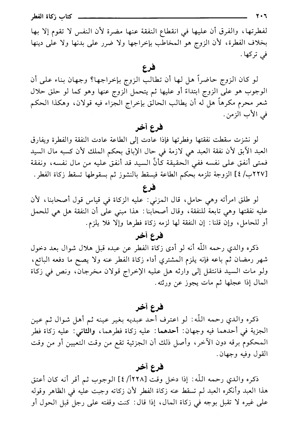 لو نشزت سقطت نفقتها وفطرتها فإذا عادت إلى الطاعة عادت النفقة والفطرة ويفارق العبد الآبق لأن نفقة العبد هي لازمة في حال الإباق لحكم الملك لأن كسبه مال السيد فمتى أنفق على نفسه ففي الحقيقة كأنَّ السيد قد أنفق عليه من مال نفسه، ونفقة [227 ب/4] الزوجة تلزمه بحكم الطاعة فيسقط بالنشوز ثم بسقوطها تسقط زكاة الفطر.