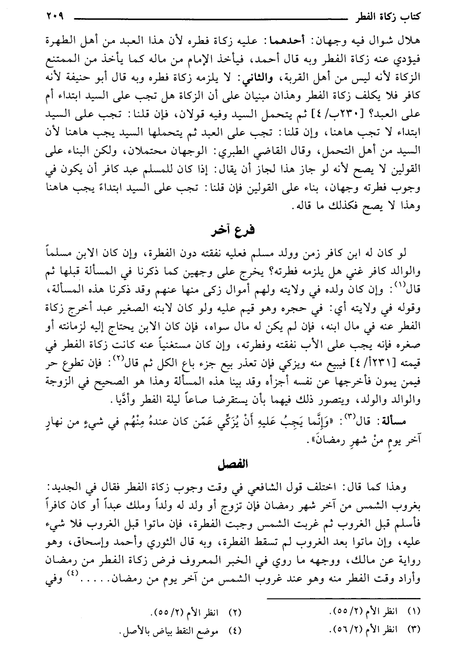 وهذا كما قال: اختلف قول الشافعي في وقت وجوب زكاة الفطر فقال في الجديد: بغروب الشمس من آخر شهر رمضان فإن تزوج أو ولد له ولدًا وملك عبدًا أو كان كافرًا فأسلم قبل الغروب ثم غربت الشمس وجبت الفطرة، فإن ماتوا قبل الغروب فلا شيء عليه، وإن ماتوا بعد الغروب لم تسقط الفطرة، وبه قال الثوري وأحمد وإسحاق، وهو رواية عن مالك، ووجهه ما روي في الخبر المعروف فرض زكاة الفطر من رمضان وأراد وقت الفطر منه وهو عند غروب الشمس من آخر يوم من رمضان ..... (¬4) وفي