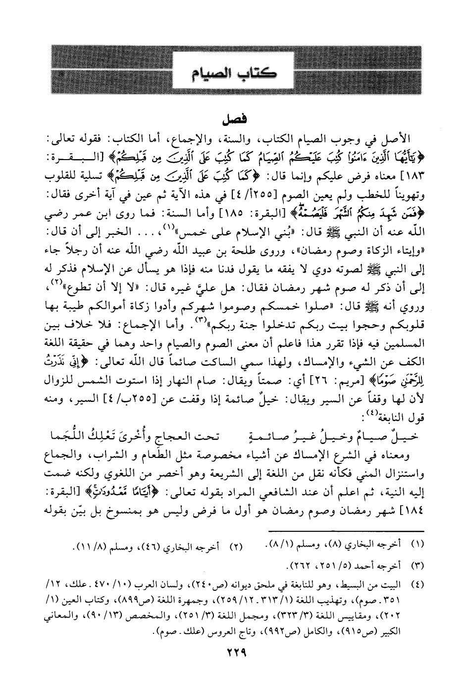 الأصل في وجوب الصيام الكتاب، والسنة، والإجماع، أما الكتاب: فقوله تعالى: {اأَيُّهَا الَّذِينَ آمَنُوا كُتِبَ عَلَيْكُمُ الصِّيَامُ كَمَا كُتِبَ عَلَى الَّذِينَ مِن قَبْلِكُمْ} [البقرة: 183] معناه فرض عليكم وإنما قال: {كَمَا كُتِبَ عَلَى الَّذِينَ مِن قَبْلِكُمْ} تسلية للقلوب وتهوينا للخطب ولم يعين الصوم [255 أ/4] في هذه الآية ثم عين في آية أخرى فقال: {فَمَن شَهِدَ مِنكُمُ الشَّهْرَ فَلْيَصُمْهُ} [البقرة: 185] وأما السنة: فما روي ابن عمر رضي الله عنه أن النبي صلى الله عليه وسلم قال: "بني الإسلام على خمس" (¬1)، ... الخبر إلى أن قال: "وإيتاء الزكاة وصوم رمضان"، وروي طلحة بن عبيد الله رضي الله عنه أن رجلاً جاء إلى النبي صلى الله عليه وسلم لصوته دوي لا يفقه ما يقول فدنا منه فإذا هو يسال عن الإسلام فذكر له إلى أن ذكر له صوم شهر رمضان فقال: هل عليَّ غيره قال: "لا إلا أن تطوع" (¬2)، وروي أنه صلى الله عليه وسلم قال: "صلوا خمسكم وصوموا شهركم وأدوا زكاة أموالكم طيبة بها قلوبكم وحجوا بيت ربكم تدخلوا جنة ربكم" (¬3). وأما الإجماع: فلا خلاف بين المسلمين فيه فإذا تقرر هذا فاعلم أن معنى الصوم والصيام واحد وهما في حقيقة اللغة الكف عن الشيء والإمساك، ولهذا سمي الساكت صائمًا قال الله تعالى: {إنيِّ نَذَرْتُ لِلرَّحْمَنِ صَوْمًا} [مريم: 26] أي: صمتًا ويقال: صام النهار إذا استوت الشمس للزوال لأن لها وقفًا عن السير ويقال: خيل صائمة إذا وقفت عن [255 ب/4] السير، ومنه قول النابغة (¬4):