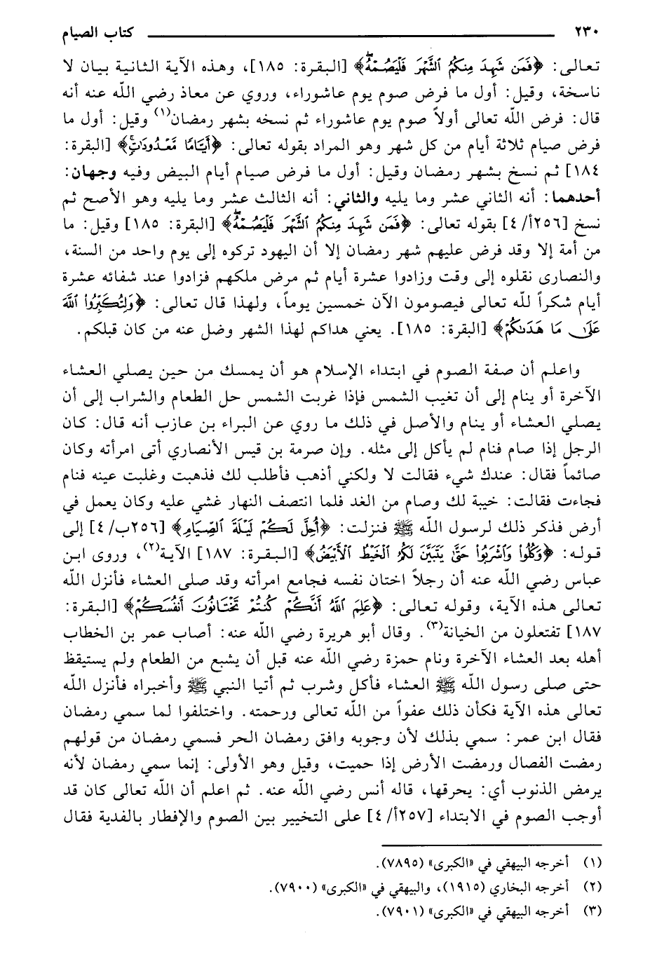 واعلم أن صفة الصوم في ابتداء الإسلام هو أن يمسك من حين يصلي العشاء الآخرة أو ينام إلى أن تغيب الشمس فإذا غربت الشمس حل الطعام والشراب إلى أن يصلي العشاء أو ينام والأصل في ذلك ما روي عن البراء بن عازب أنه قال: كان الرجل إذا صام فنام لم يأكل إلى مثله. وإن صرمة بن قيس الأنصاري أتى امرأته وكان صائمًا فقال: عندك شيء فقالت لا ولكني أذهب فأطلب لك فذهبت وغلبت عينه فنام فجاءت فقالت: خيبة لك وصام من الغد فلما انتصف النهار غشي عليه وكان يعمل في أرض فذكر ذلك لرسول الله صلى الله عليه وسلم فنزلت: {أُحِلَّ لَكُمْ لَيْلَةَ الصِّيَامِ} [256 ب/4] إلى قوله: {وكُلُوا واشْرَبُوا حَتَّى يَتَبَيَّنَ لَكُمُ الخَيْطُ الأَبْيَضُ} [البقرة: 187] الآية (¬2)، وروى ابن عباس رضي الله عنه أن رجلاً اختان نفسه فجامع امرأته وقد صلى العشاء فأنزل الله تعالى هذه الآية، وقوله تعالى {عَلِمَ اللَّهُ أَنَّكُمْ كُنتُمْ تَخْتَانُونَ أَنفُسَكُمْ} [البقرة: 187] تفتعلون من الخيانة (¬3). وقال أبو هريرة رضي الله عنه: أصاب عمر بن الخطاب أهله بعد العشاء الآخرة ونام حمزة رضي الله عنه قبل أن يشبع من الطعام ولم يستيقظ حتى صلى رسول الله صلى الله عليه وسلم العشاء فأكل وشرب ثم أتيا النبي صلى الله عليه وسلم وأخبراه فأنزل الله تعالى هذه الآية فكأن ذلك عفوًا من الله تعالى ورحمته. واختلفوا لما سمي رمضان فقال ابن عمر: سمي بذلك لأن وجوبه وافق رمضان الحر فسمي رمضان من قولهم رمضت الفصال ورمضت الأرض إذا حميت، وقيل وهو الأولى: إنما سمي رمضان لأنه يرمض الذنوب أي: يحرقها، قاله أنس رضي الله عنه. ثم اعلم أن الله تعالى كان قد أوجب الصوم في الابتداء [257 أ/4] على التخيير بين الصوم والإفطار بالفدية فقال