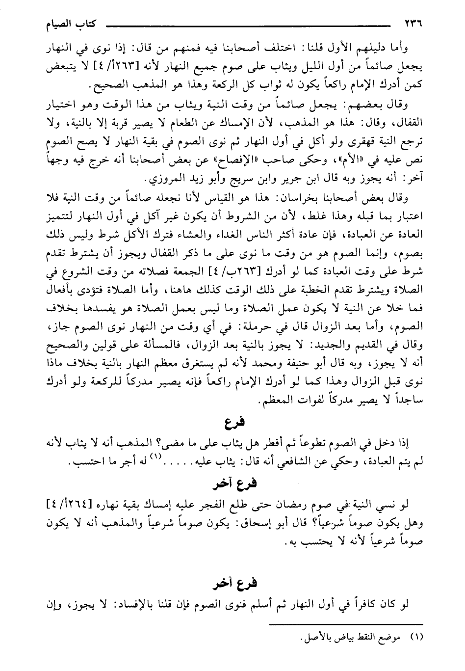 وأما دليلهم الأول قلنا: اختلف أصحابنا فيه فمنهم من قال: إذا نوى في النهار يجعل صائما من أ, ل الليل ويثاب على صوم جميع النهار لأنه [263 أ/4] لا يتبعض كمن أدرك الإمام يكون له ثواب كل الركعة وهذا هو المذهب الصحيح.