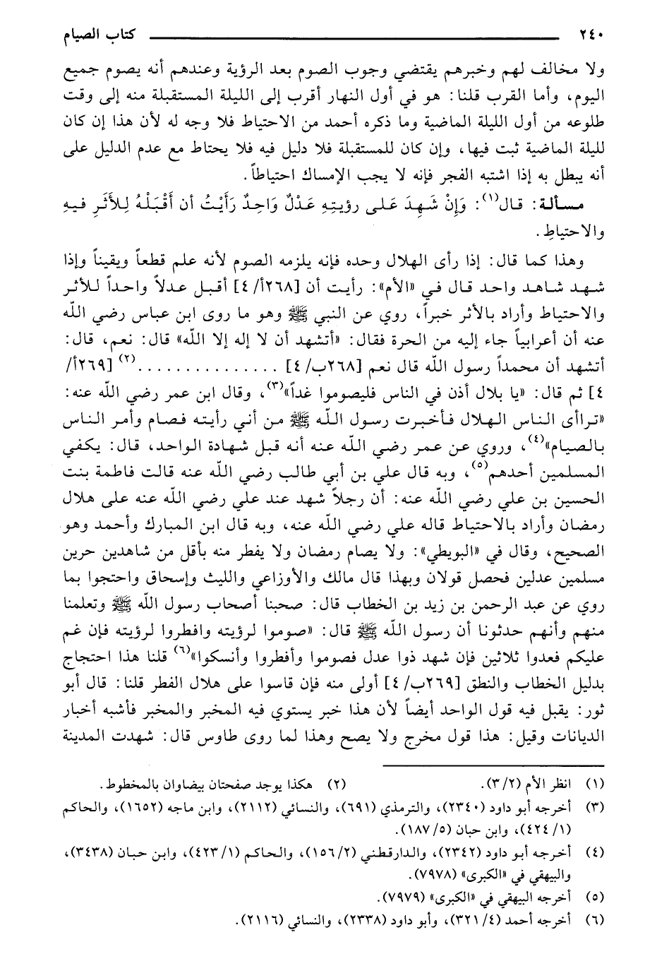 ولا مخالف لهم وخبرهم يقتضى وجوب الصوم بعد الرؤية وعندهم أنه يصوم جميع اليوم, وأما القرب قلنا: هو في أ, ل النهار أقرب إلى الليلة المستقبلة منه إلى وقت طلوعه من أول الليلة الماضية وما ذكره أحمد من الاحتياط في وجه له لأن هذا ان كان لليلة الماضية ثبت فيها, وان كان للمستقبلة في دليل فيه فلا يحتاط مع عدم الدليل على أنه يبطل به إذا اشتبه الفجر فإنه لا يجب الإمساك احتياطا.