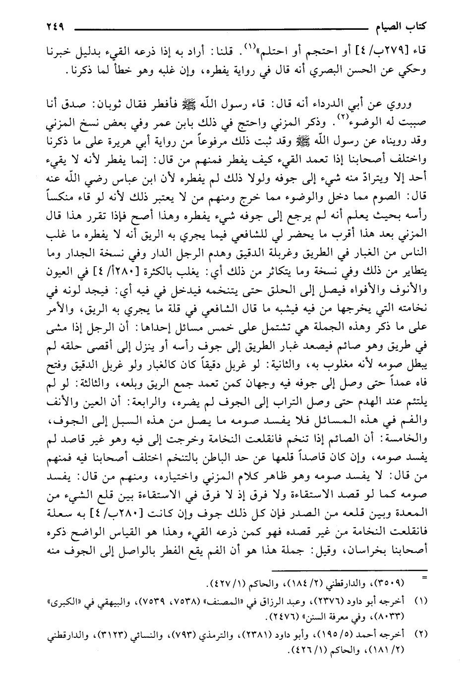وروي عن أبي الدرداء أنه قال: قاء رسول الله صلى الله عليه وسلم فأفطر فقال ثوبان: صدق أنا صببت له الوضوء (¬2). وذكر المزني واحتج في ذلك بابن عمر وفي بعض نسخ المزني وقد رويناه عن رسول الله صلى الله عليه وسلم وقد ثبت ذلك مرفوعًا من رواية أبى هريرة على ما ذكرنا واختلف أصحابنا إذا تعمد القيء كيف يفطر فمنهم من قال: إنما يفطر لأنه لا يقيء أحد إلا ويترادّ منه شيء إلى جوفه ولولا ذلك لم يفطره لأن ابن عباس رضي الله عنه قال: الصوم مما دخل والوضوء مما خرج ومنهم من لا يعتبر ذلك لأنه لو قاء منكسًا رأسه بحيث يعلم أنه لم يرجع إلى جوفه شيء يفطره وهذا أصح فإذا تقرر هذا قال المزني بعد هذا أقرب ما يحضر لي للشافعي فيما يجري به الريق أنه لا يفطره ما غلب الناس من الغبار في الطريق وغربلة الدقيق وهدم الرجل الدار وفي نسخة الجدار وما يتطاير من ذلك وفي نسخة وما يتكاثر من ذلك أي: يغلب بالكثرة [280 أ/4] في العيون والأنوف والأفواه فيصل إلى الحلق حتى يتنخمه فيدخل في فيه أي: فيجد لونه في نخامته التي يخرجها من فيه فيشبه ما قال الشافعي في قلة ما يجري به الريق، والأمر على ما ذكر وهذه الجملة هي تشتمل على خمس مسائل إحداها: أن الرجل إذا مشى في طريق وهو صائم فيصعد غبار الطريق إلى جوف رأسه أو ينزل إلى أقصى حلقه لم يبطل صومه لأنه مغلوب به، والثانية: لو غربل دقيقًا كان كالغبار ولو غربل الدقيق وفتح فاه عمدًا حتى وصل إلى جوفه فيه وجهان كمن تعمد جمع الريق وبلعه، والثالثة: لو لم يلتئم عند الهدم حتى وصل التراب إلى الجوف لم يضره، والرابعة: أن العين والأنف والفم في هذه المسائل فلا يفسد صومه ما يصل من هذه السبل إلى الجوف، والخامسة: أن الصائم إذا تنخم فانقلعت النخامة وخرجت إلى فيه وهو غير قاصد لم يفسد صومه، وإن كان قاصدًا قلعها عن حد الباطن بالتنخم اختلف أصحابنا فيه فمنهم من قال: لا يفسد صومه وهو ظاهر كلام المزني واختياره، ومنهم من قال: يفسد صومه كما لو قصد الاستقاءة ولا فرق إذ لا فرق في الاستقاءة بين قلع الشيء من المعدة وبين قلعه من الصدر فإن كل ذلك جوف وإن كانت [280 ب/4] به سلعة فانقلعت النخامة من غير قصده فهو كمن ذرعه القيء وهذا هو القياس الواضح ذكره أصحابنا بخراسان، وقيل: جملة هذا هو أن الفم يقع الفطر بالواصل إلى الجوف منه