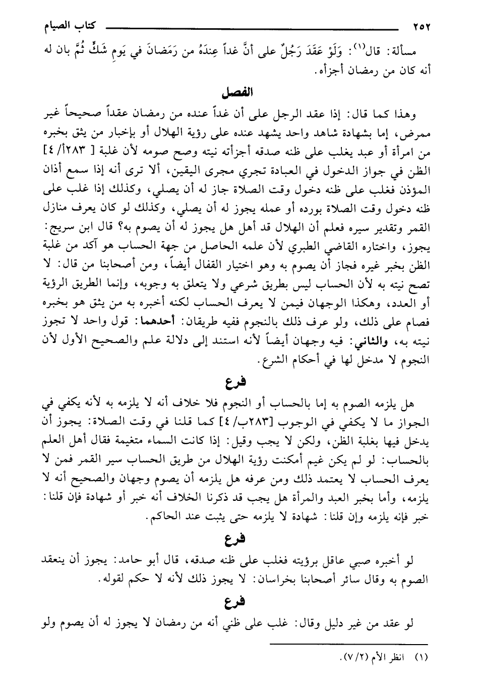 هل يلزمه الصوم به إما بالحساب أو النجوم فلا خلاف أنه لا يلزمه به لأنه يكفي في الجواز ما لا يكفي في الجوب [283 ب/4] كما قلنا في وقت الصلاة: يجوز أن يدخل فيها بغلبة الظن، ولكن لا يجب وقيل: إذا كانت السماء متغيمة فقال أهل العلم بالحساب: لو لم يكن غيم أمكنت رؤية الهلال من طريق الحساب سير القمر فمن لا يعرف الحساب لا يعتمد ذلك ومن عرفه هل يلزمه أن يصوم وجهان والصحيح أنه لا يلزمه حتى يثبت عند الحاكم.