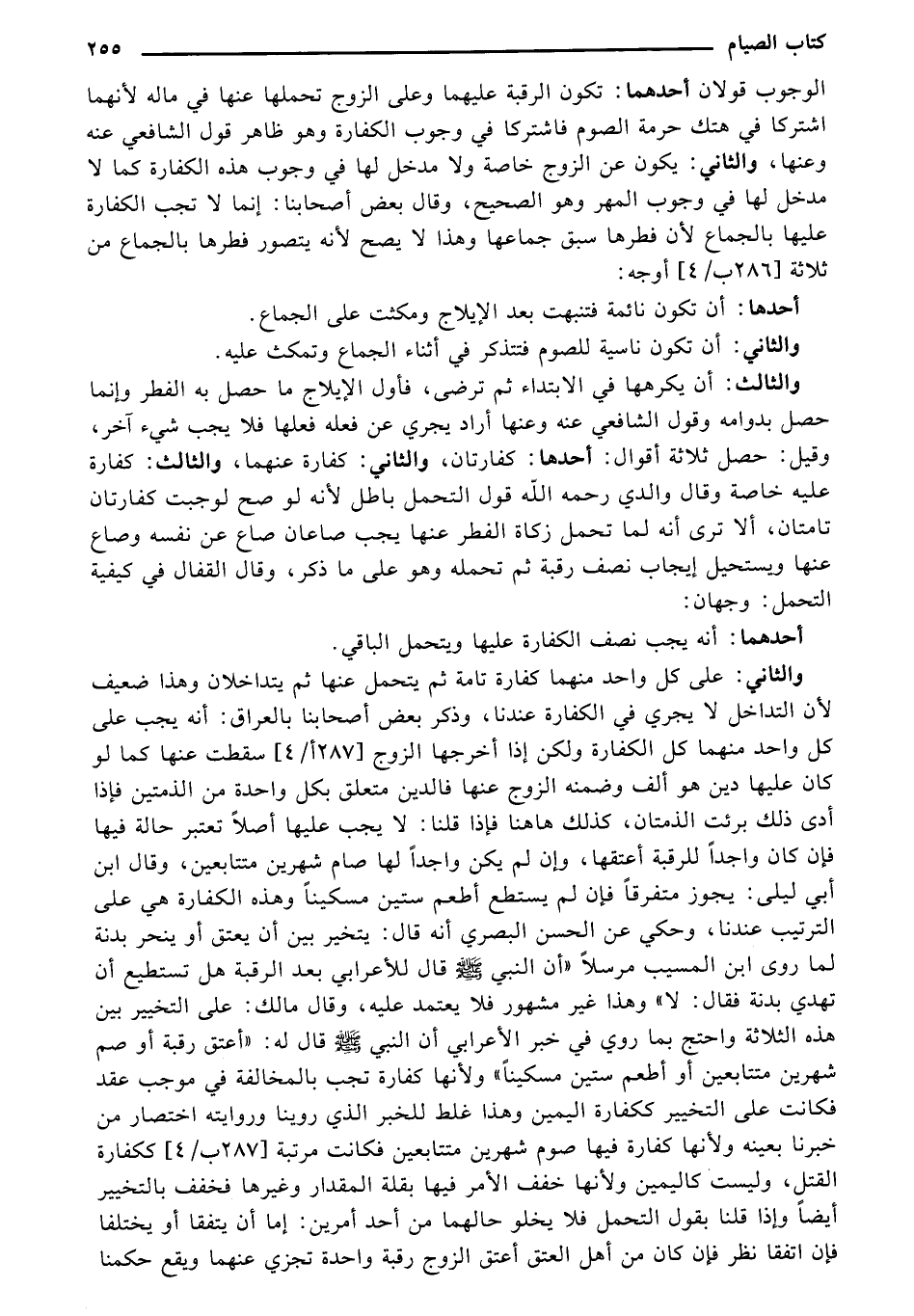 والثالث: أن يكرهها في الابتداء ثم ترضى، فأول الإيلاج ما حصل به الفطر وإنما حصل بدوامه وقول الشافعي عنه وعنها أراد يجري عن فعله فعلها فلا يجب شيء آخر، وقيل: حصل ثلاثة أقوال: أحدها: كفارتان، والثاني: كفارة عنهما، والثالث: كفارة عليه خاصة وقال والدي رحمه الله قول التحمل باطل لأنه لو صح لوجبت كفارتان تامتان، ألا ترى أنه لما تحمل زكاة الفطر عنها يجب صاعان صاع عن نفسه وصاع عنها ويستحيل إيجاب نصف رقبة ثم تحمله وهو على ما ذكر، وقال القفال في كيفية التحمل: وجهان: