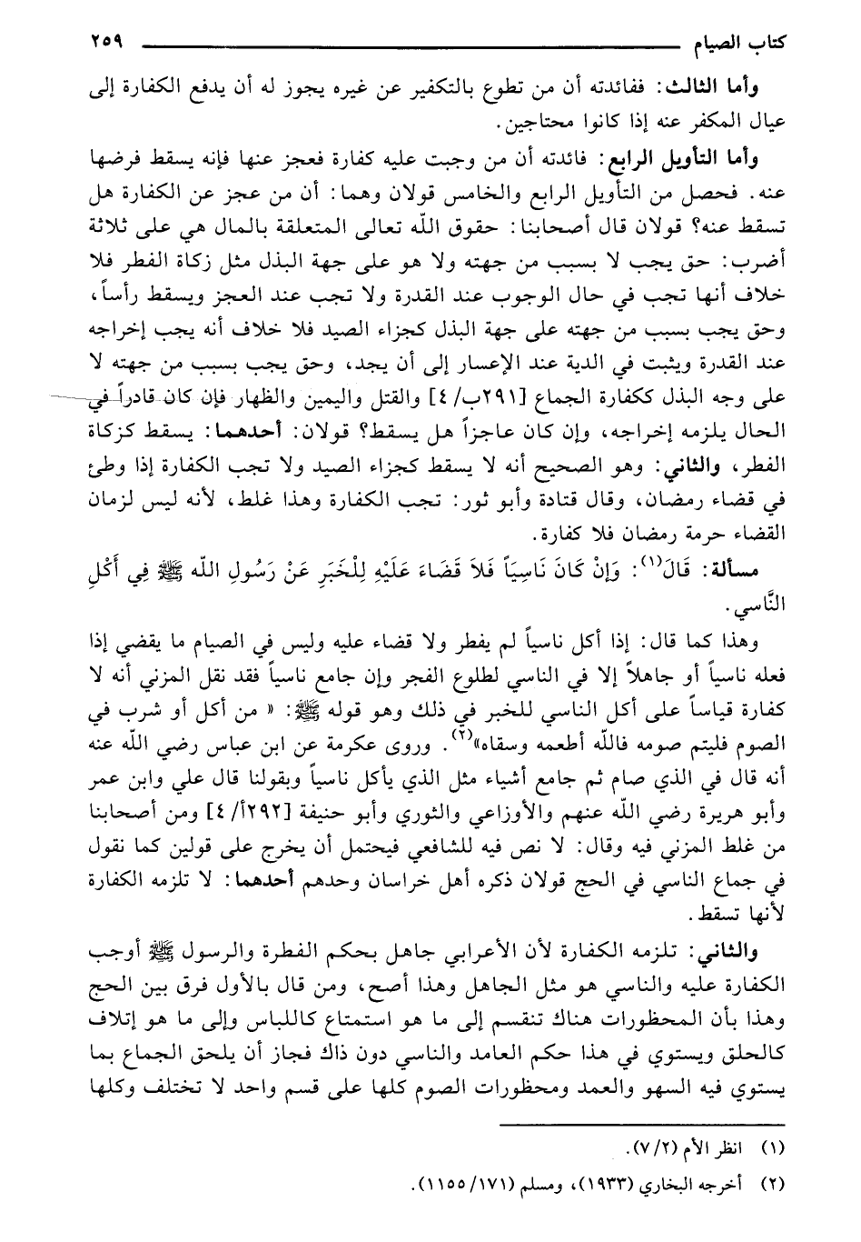 والثاني: تلزمه الكفارة لأن الأعرابي جاهل بحكم الفطر والرسول صلى الله عليه وسلم أوجب الكفارة عليه والناسي هو مثل الجاهل وهذا أصح، ومن قال بالأول فرق بين الحج وهذا بأن المحظورات هناك تنقسم إلى ما هو استمتاع كاللباس وإلى ما هو إتلاف كالحلق ويستوي في هذا حكم العامد والناسي دون ذاك فجاز أن يلحق الجماع بما يستوي فيه السهو والعمد ومحظورات الصوم كلها على قسم واحد لا تختلف وكلها