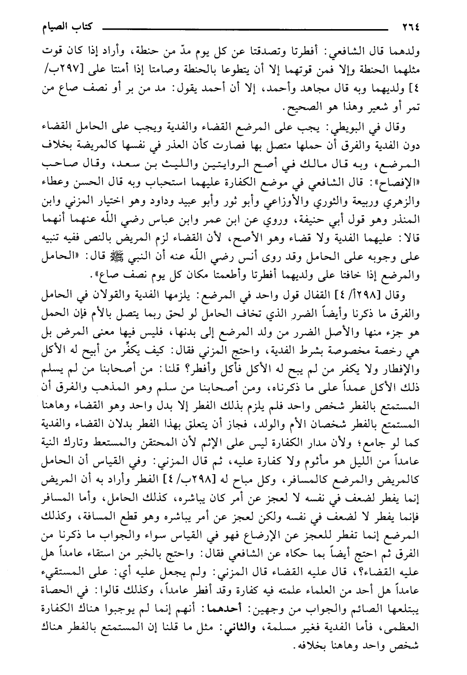 وقال في البويطي: يجب على المرضع القضاء والفدية ويجب على الحامل القضاء دون الفدية والفرق أن حملها متصل بها فصارت كأن العذر في نفسها كالمريضة بخلاف المرضع، وبه قال مالك في أصح الروايتين والليث بن سعد، وقال صاحب "الإصلاح": قال الشافعي في موضع الكفارة عليهما استحباب وبه قال الحسن وعطاء والزهري وربيعة والثوري والأوزاعي وأبو ثور وأبو عبيد وداود وهو اختيار المزني وابن المنذر وهو قول أبي حنيفة، وروي عن ابن عمر وابن عباس رضي الله عنهما أنهما قالا: عليهما الفدية ولا قضاء وهو الأصح، لأن القضاء لزم المريض بالنص ففيه تنبيه على وجوبه على الحامل وقد روي أنس رضي الله عنه أن النبي صلى الله عليه وسلم قال: "الحامل والمرضع إذا خافتا على ولديهما أفطرتا وأطعمتا مكان كل يوم نصف صاع".