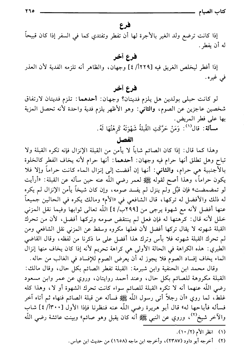 وهذا كما قال: إذا كان الصائم شابًا لا يأمن من القبلة الإنزال فإنه تكره القبلة ولا تباح وهل تطلق أنها حرام فيه وجهان: أحدهما: أنها حرام لأنه يخاف الفطر كالخلوة بالأجنبية هي حرام، والثاني: أنها إن أفضت إلى إنزال الماء كانت حرامًا وإلا فلا يكون حرامًا، وهذا أصح لقوله صلى الله عليه وسلم لعمر رضي الله عنه حين سأله عن القبلة: "أرأيت لو تمضمضت" فإن قبَّل ولم ينزل لم يفسد صومه، وإن كان شيخًا يأمن الإنزال لم يكره له ذلك والأفضل له تركها، قال الشافعي في "الأم" ومالك يكره في الحالين جميعًا عنها أفضل لأنه مع شهوة يرجى من [299 ب/4] الله تعالى ثوابها وفيما نقل المزني خلل لأنه قال: كرهتها له فإن فعل لم ينتقض صومه وتركها أفضل، لأن من تحرك القبلة شهوته لا يقال تركها أفضل لأن فعلها مكروه وسقط عن المزني نقل الشافعي ومن لم تحرك القبلة شهوته فلا بأس وترك هذا أفضل على ما ذكرناه من لفظه، وقال القاضي الطبري: هذه الكراهة في الحالة الأولى هي كراهة تحريم لأنه إذا كان يخاف منها إنزال الماء يخاف إفساد الصوم فلا يجوز له أن يعرض الصوم للإفساد في الغالب من حاله.