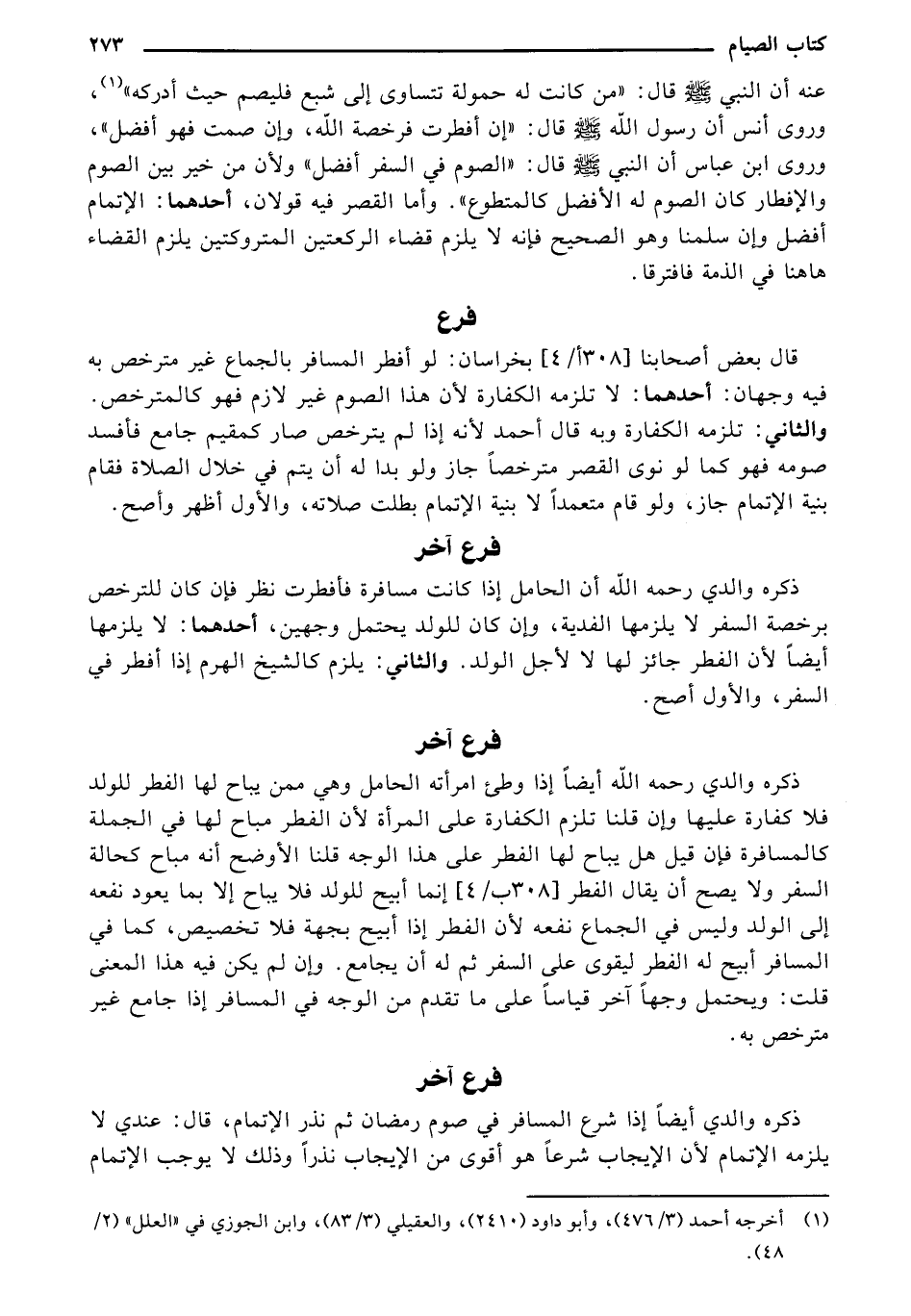 ذكره والدي رحمه الله أن الحامل إذا كانت سافرة فأفطرت نظر فإن كان للترخص برخصة السفر لا يلزمها الفدية، وإن كان للولد يحتمل وجهين، أحدهما: لا يلزمها أيضًا لأن الفطر جائز لها لا لأجل الولد. والثاني: يلزم كالشيخ الهرم إذا أفطر في السفر، والأول أصح.