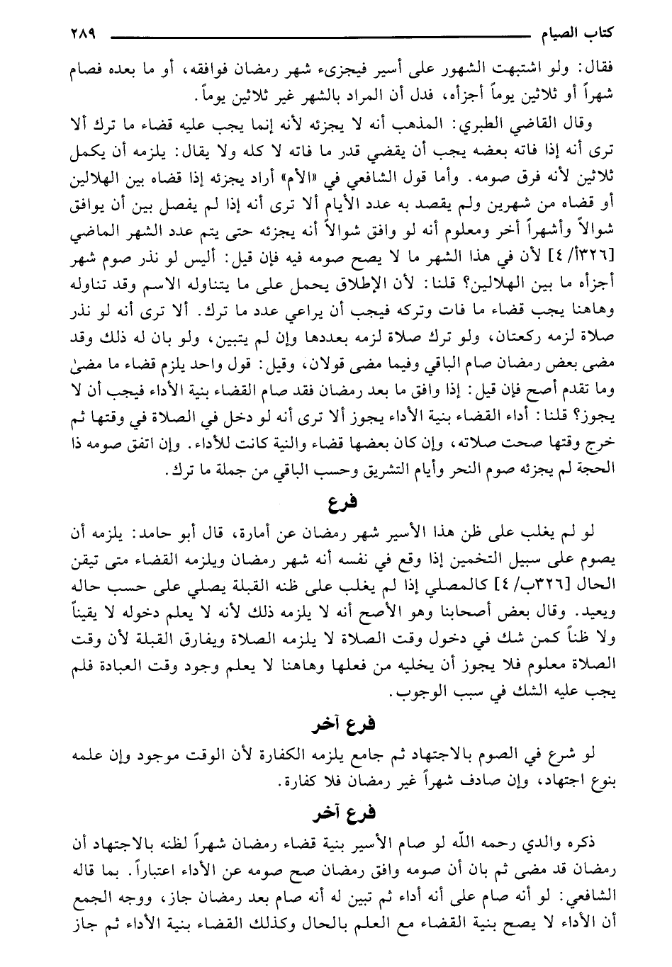 ذكره والدي رحمه الله لو صام الأسير بنية قضاء رمضان شهراً لظنه بالاجتهاد أن رمضان قد مضى ثم بان أن صومه وافق رمضان صح صومه عن الأداء اعتباراً. بما قاله الشافعي: لو أنه صام على أنه أداء ثم تبين له أنه صام بعد رمضان جاز، ووجه الجمع أن الأداء لا يصح بنية القضاء مع العلم بالحال وكذلك القضاء بنية الأداء ثم جاز