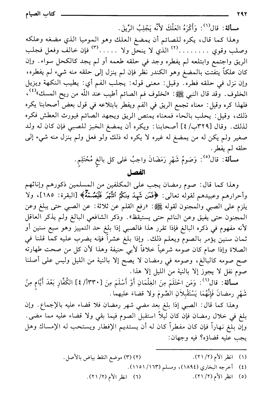 وهذا كما قال، يكره للصائم أن يمضغ العلك وهو الموميا الذي مضغه وعلكه وصلب وقوي ....... (¬2) الذي لا ينحل ولا ......... (¬3) فإن خالف وفعل فجلب الريق واجتمع وابتلعه لم يفطره وجد في حلقه طعمه أو لم يجد كالكحل سواء. وإن كان علكًا يتفتت بالمضغ وهو الكندر نظر فإن لم ينزل إلى حلقه شيء لم يفطره، وإن نزل في حلقه فطره. وقيل: معنى قوله: يجلب الفم أي: يطيب النكهة ويزيل الخلوف. وقد قال النبي صلى الله عليه وسلم: "لخلوف فم صائم أطيب عند الله من ريح المسك" (¬4)، فلهذا كره وقيل: معناه تجمع الريق في الفم ويفطر بابتلاعه في قول بعض أصحابنا يكره ذلك، وقيل: يحلب بالحاء فمعناه يمتص الريق ويجهد الصائم فيورث العطش فكره لذلك. وقال [329 ب/4] أصحابنا: ويكره أن يمضغ الخبز للصبي فإن كان له ولد صغير ولم يكن له من يمضغ له غيره لا يكره له ذلك ولو فعل ولم ينزل منه شيء إلى حلقه لم يفطر.