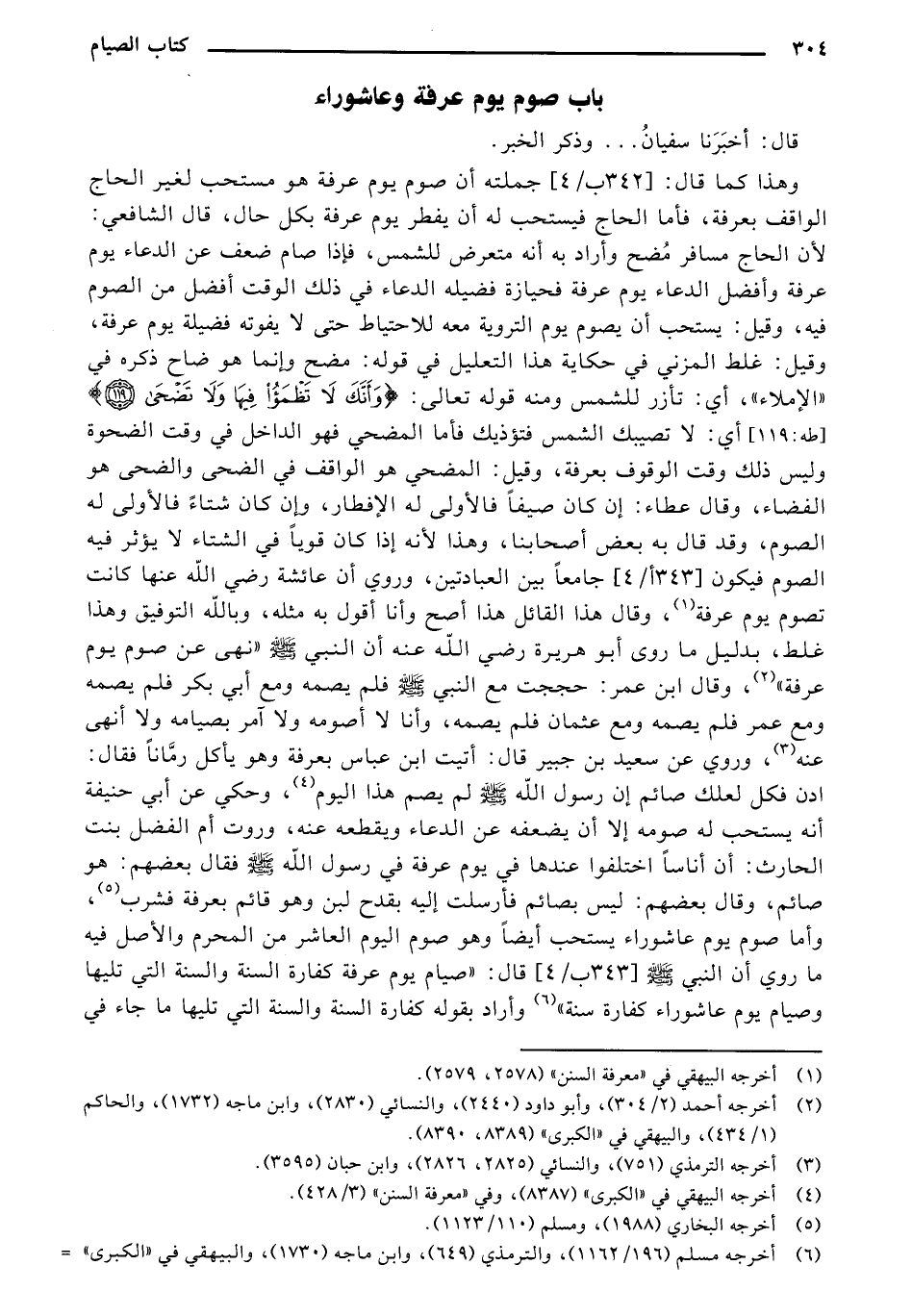 وهذا كما قال: [342 ب/ 4] جملته أن صوم يوم عرفة هو مستحب لغير الحاج الواقف بعرفة، فأما الحاج فيستحب له أن يفطر يوم عرفة بكل حال، قال الشافعي: لأن الحاج مسافر مُضح وأراد به أنه متعرض للشمس، فإذا صام ضعف عن الدعاء يوم وأفضل الدعاء يوم عرفة فحيازة فضيلة الدعاء في ذلك الوقت أفضل من الصوم فيه، وقبل: يستحب أن يصوم يوم التروية معه للاحتياط حتى لا يفرته فضيلة يوم عرفة، وقيل: غلط المزني في حكاية هذا التعليل في قوله: مضح وإنما هو ضاح ذكره في "الإملاء "، أي: تأزر للمس ومنه قوله تعالى: {وأَنَّكَ لا تَظْمَأُ فِيهَا ولا تَضْحَى} [طه: 119] أي: لا تصيبك الشمس فتؤذيك فأما المضحي فهو الداخل في وقت الضحوة وليس ذلك وقت الوقوف بعرفة، وقيل: المضحي هو الواقف في الضحى والضحى هو الفضاء، وقال عطاء: إن كان صيفًا فالأولى له الإفطار، وإن كان شتاًء فالأولى له الصوم، وقد قال به بعض أصحابنا، وهذا لأنه إذا كان قويًا في الشتاء لا يؤثر فيه الصوم فيكون [343 أ/ 4] جامعًا بين العبادتين، وروي أن عائشة رضي الله عنها كانت تصوم يوم عرفة (¬1)، وقال هذا القائل هذا اصح وأنا أقول به مثله، وبالله التوفيق وذا غلط، بدليل ما روى أبو هريرة رضي الله عنه أن النبي صلى الله عليه وسلم "نهى عن صوم يوم عرفة (¬2) "، وقال ابن عمر: حججت مع النبي صلى الله عليه وسلم فلم يصمه ومع أبي بكر فلم يصمه ومع عمر فلم يصمه ومع عثمان فلم يصمه، وأنا لا أصومه ولا آمر بصيامه ولا أنهي عنه (¬3)، وروي عن سعيد بن جبير قال: أتيت ابن عباس بعرفة وهو يأكل رمَّانَا فقال: ادن فكل لعلك صائم إن رسول الله صلى الله عليه وسلم لم يصم هذا اليوم (¬4)، وحكي عن أبي حنيفة أنه يستحب له صومه إلا أن يضعفه عن الدعاء ويقطعه عنه، وروت أم الفضل بنت الحارث: أن أناسًا اختلفوا عندها في يوم عرفة في رسول الله صلى الله عليه وسلم فقال بعضهم: هو صائم، وقال بعضهم: ليس بصائم فأرسلت إليه بقدح لبن وهو قائم بعرفة فشرب (¬5)، وأما صوم يوم عاشوراء يستحب أيضًا وهو صوم اليوم العاشر من المحرم والأصل فيه ما روي أن النبي صلى الله عليه وسلم [343 ب/ 4] قال: "صيام يوم عرفة كفارة السنة والسنة التي تليها وصيام يوم عاشوراء كفارة سنة (¬6) " وأراد بقوله كفارة السنة والسنة التي تليها ما جاء في
