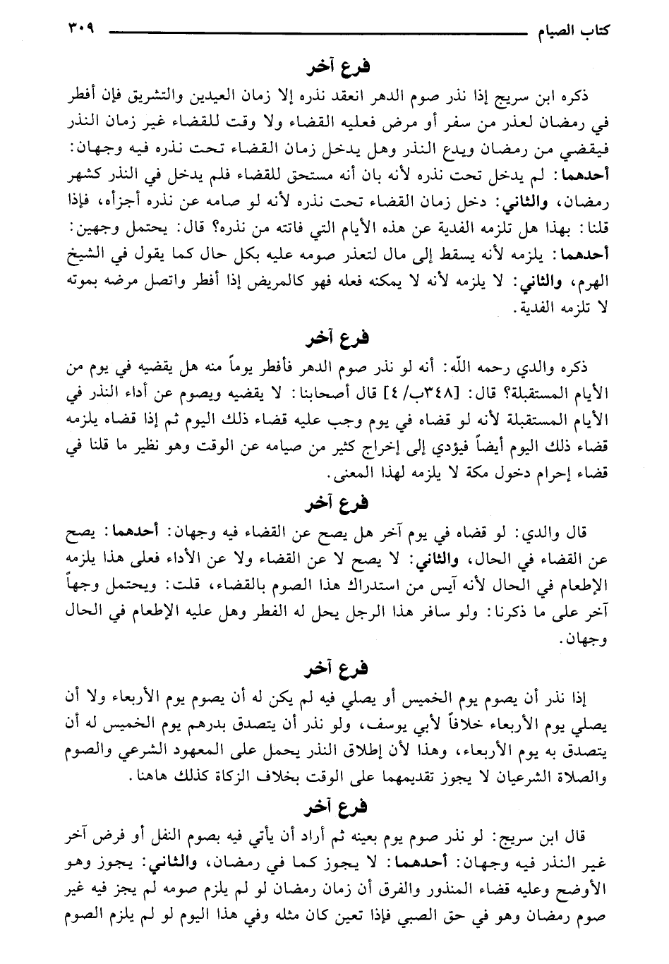 ذكره ابن سريح إذا نذر صوم الدهر انعقد نذره إلا زمان العيدين والتشريق فإن أفطر في رمضان لعذر من سفر أو مرض فعليه القضاء ولا وقت للقضاء غير زمان النذر فيقضي من رمضان ويدع النذر وهل يدخل زمان القضاء تحت نذره فيه وجهان: أحدهما: لم يدخل تحت نذره لأنه بان أنه مستحق للقضاء فلم يدخل في النذر كشهر رمضان، والثاني: دخل زمان القضاء تحت نذره لأنه لو صامه عن نذره أجزأه، فإذا قلنا: بهذا هل تلزمه الفدية عن هذه الأيام التي فاتته من نذره؟ قال: يحتمل وجهين: أحدهما: يلزمه لأنه بسقط إلى مال لتعذر صومه عليه بكل حال كما يقول في الشيخ الهرم، والثاني: لا يلزمه لأنه لا يمكنه فعله فهو كالمريض إذا أفطر واتصل مرضه بموته لا تلزمه الفدية.