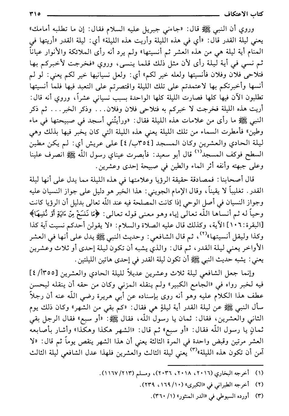 وروي أن النبي صلى الله عليه وسلم قال: "جاءني جبريل عليه السلام فقال: إن ما تطلبه أمامك "يعني ليلة القدر قال: "أي في هذه الليلة واريت هذه الليلة "أي: ليلة القدر "أريتها في المنام أية ليلة هي من هذه العشر ثم أنسيتها "ولم يرد أنه رأى الملائكة والأنوار عيانًا ثم نسى في أية ليلة رأى لأن مثل ذلك قلما ينسى، وروي "فخرجت لأخبركم بها فتلاحي فلان وفلان فأنسيتها ولعله خير لكم "أي: ولعل نسيانيها حير لكم يعني: لو لم أنسها وأخبرتكم بها لاعتمدتم على تلك الليلة واقتصرتم على التعبد فيها قلما أنسيتها تطلبون الآن فيها كلها فصارت الليلة كلها الواحدة بسبب نسياني عشرًا، وروي أنه قال: أريت هذه الليلة فخرجت لأخبركم به فتلاحى فلان وفلان .. وذكر الخبر ... ثم ذكر النبي صلى الله عليه وسلم ما رأى من علامات هذه الليلة فقال: "ورأيتُني أسجد في صبيحتها في ماء وطين "فأمطرت السماء من تلك الليلة يعني هذه الليلة التي كان يخبر فيها بذلك وهي ليلة الحادي والعشرين وكان المسجد [354 ب/ 4] على عريش أي: لم يكن مطين السطح فوكف المسجد (¬1) قال أبو سعيد: فأبصرت عيناي رسول الله صلى الله عليه وسلم انصرف علينا وعلى جبته وأنفه الماء والطين في صبيحة إحدى وعشرين.