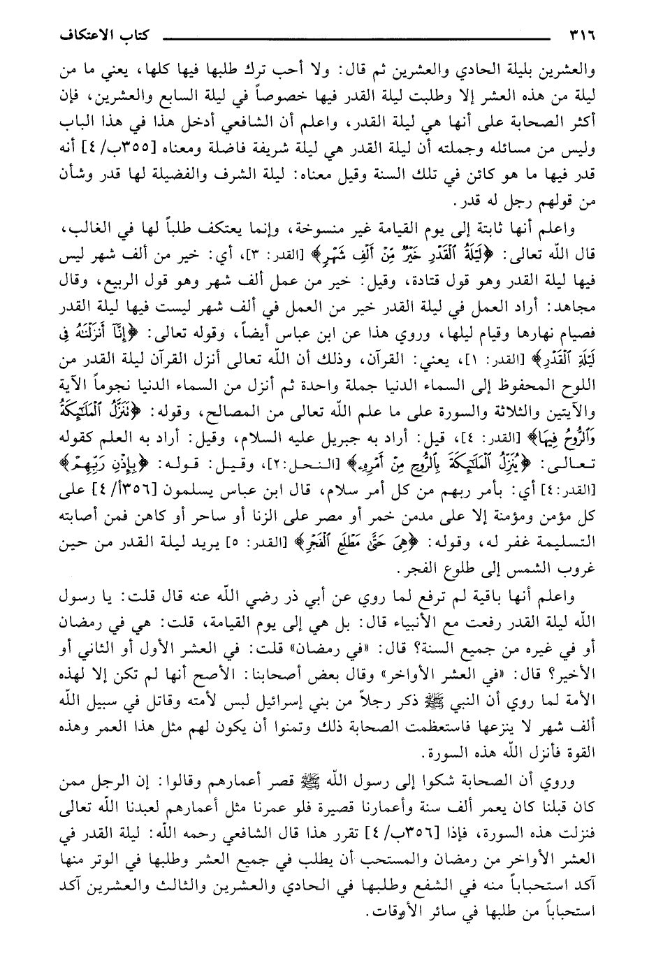وأعلن أنها ثابتة غلى يوم القيامة غير منسوخة، وإنما يعتكف طلبًا لها في الغالب، قال الله تعالى: {لَيْلَةُ القَدْرِ خَيْرٌ مِّنْ أَلْفِ شَهْرٍ} [القدر: 3]، أي: خير من ألف شهر ليس فيها ليلة القدر وهو قول قتادة، وقيل: خير من عمل ألف شهر وهو قول الربيع، وقال مجاهد: أراد العمل في ليلة القدر خير من العمل في ألف شهر ليست فيها ليلة القدر فصيام نهارها وقيام ليلها، وروي هذا عن ابن عباس أيضًا، وقوله تعالى: {إنَّا أَنزَلْنَاهُ فِي لَيْلَةِ القَدْرِ} [القدر:1]، يعني: القرآن، وذلك أن الله تعالى أنزل القرآن ليلة القدر من اللوح المحفوظ إلى السماء الدنيا جملة واحدة ثم أنزل من السماء الدنيا نجومًا الآية والآيتين والثلاثة والسورة على ما علم الله تعالى من المصالح، وقوله: {تَنَزَّلُ المَلائِكَةُ والرُّوحُ فِيهَا} [القدر: 4]، قيل: أراد به جبريل عليه السلام، وقيل: أراد به العلم كقوله تعالى: {يُنَزِّلُ المَلائِكَةَ بِالرُّوحِ مِنْ أَمْرِهِ} [النحل: 2]، وقيل: قوله: {بِإذْنِ رَبِّهِم} [القدر: 4] أي: بأمر ربهم من كل أمر سلام، قال ابن عباس يسلمون [356 أ/ 4] على كل مؤمن ومؤمنة إلا على مدمن خمر أو مصر على الزنا أو ساحر أو كاهن فمن إصابته التسليمة غفر له، وقوله: {هِيَ حَتَّى مَطْلَعِ الفَجْرِ} [القدر: 5] يريد ليلة القدر من حين غروب الشمس إلى طلوع الفجر.