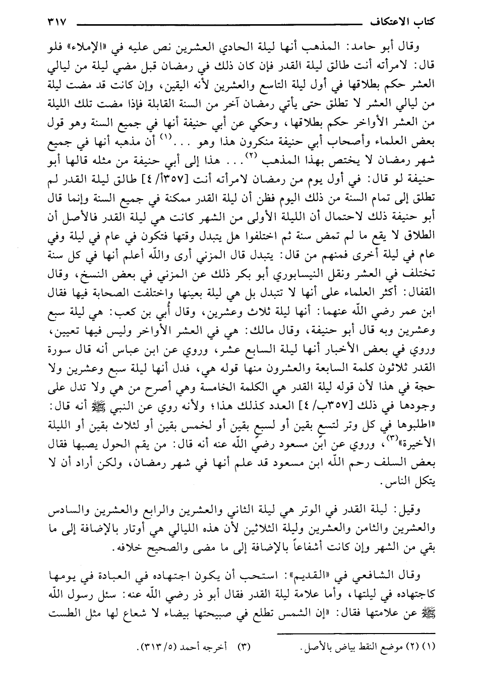 وقال أبو حامد: المذهب أنها ليلة الحادي والعشرين نص عليه في "الإملاء "فلو قال: لامرأته أنت طالق ليلة القدر فإن كان ذلك في رمضان قبل مضي ليلة من ليالي العشر حكم بطلاقها في أول ليلة التاسع والعشرين لأنه اليقين، وإن كانت قد مضت ليلة من ليالي العشر لا تطلق حتى يأتي رمضان آخر من السنة القابلة فإذا مضت تلك الليلة من العشر الأواخر حكم بطلاقها، وحكي عن أبي حنيفة أنها في جميع السنة وهو قول بعض العلماء وأصحاب أبي حنيفة منكرون ذا وهو ... (¬1) أن مذهبه أنها في جميع شهر رمضان لا يختص بهذا المذهب (¬2) ... هذا إلى أبي حنيفة من مثله قالها أبو حنيفة لو قال: في أول يوم من رمضان لامرأته أنت [357 أ/ 4] طالق ليلة القدر لم تطلق إلى تمام السنة من ذلك اليوم فظن أن ليلة القدر ممكنة في جميع السنة وغنما قال أبو حنيفة ذلك لاحتمال أن الليلة الأولى من الشهر كانت هي ليلة القدر فالأصل أن الطلاق لا يقع ما لم تمض سنة ثم اختلفوا هل يتبدل وقتها فتكون في عام في ليلة وفي عام في ليلة أخرى فمنهم من قال: يتبدل قال المزني أرى والله أعلم أنها في كل سنة تختلف في العشر ونقل النيسابوري أبو بكر ذلك عن المزني في بعض النسخ، وقال القفال: أكثر العلماء على أنها لا تتبدل بل هي ليلة بعينها واختلفت الصحابة فيها فقال ابن عمر رضي الله عنهما: أنها ليلة ثلاث وعشرين، وقال أُبي بن كعب: هي ليلة سبع وعشرين وبه قال أبو حنيفة، وقال مالك: هي في العشر الأواخر وليس فيها تعيين، وروي في بعض الأخبار أنها ليلة السابع عشر، وروي عن ابن عباس أنه قال سورة القدر ثلاثون كلمة السابعة والعشرون منها قوله هي، فدل أنها ليلة سبع وعشرين ولا حجة في هذا لأن قوله ليلة القدر هي الكلمة الخامسة وهي أصرح من هي ولا تدل على وجودها في ذلك [357 ب/ 4] العدد كذلك هذا؛ ولأنه روي عن النبي صلى الله عليه وسلم أنه قال: "اطلبوها في كل وتر لتسع بقين أو لسبع بقين أو لخمس بقين أو لثلاث بقين أو الليلة الأخيرة (¬3) "، وروي عن ابن مسعود رضي الله عنه أنه قال: من يقم الحول يصبها فقال بعض السلف رحم الله ابن مسعود قد علم أنها في شهر رمضان، ولكن أراد أن لا يتكل الناس.