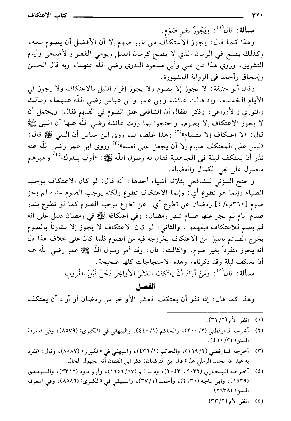 وقال أبو حنيفة: لا يجوز غلا بصوم ولا يجوز إفراد الليل بالاعتكاف ولا يجوز في الأيام الخمسة، وبه قالت عائشة وابن عمر وابن عباس رضي الله عنهما، ومالك والثوري والأوزاعي، وذكر القفال أن الشافعي علق الصوم في القديم فقال: ويحتمل أن لا يجوز الاعتكاف إلا بصوم، واحتجوا بما روت عائشة رضي الله عنها أن النبي صلى الله عليه وسلم قال: "لا اعتكاف إلا بصيام (¬2) " وهذا غلط، لما روى ابن عباس أن النبي صلى الله عليه وسلم قال: "ليس على المعتكف صيام إلا أن يجعل على نفسه (¬3) "وروى ابن عمر رضي الله عنه نذر أن يعتكف ليلة في الجاهلية فقال له رسول الله صلى الله عليه: "أوف بنذرك (¬4) "وخبرهم محمول على نفي الكمال والفضيلة.