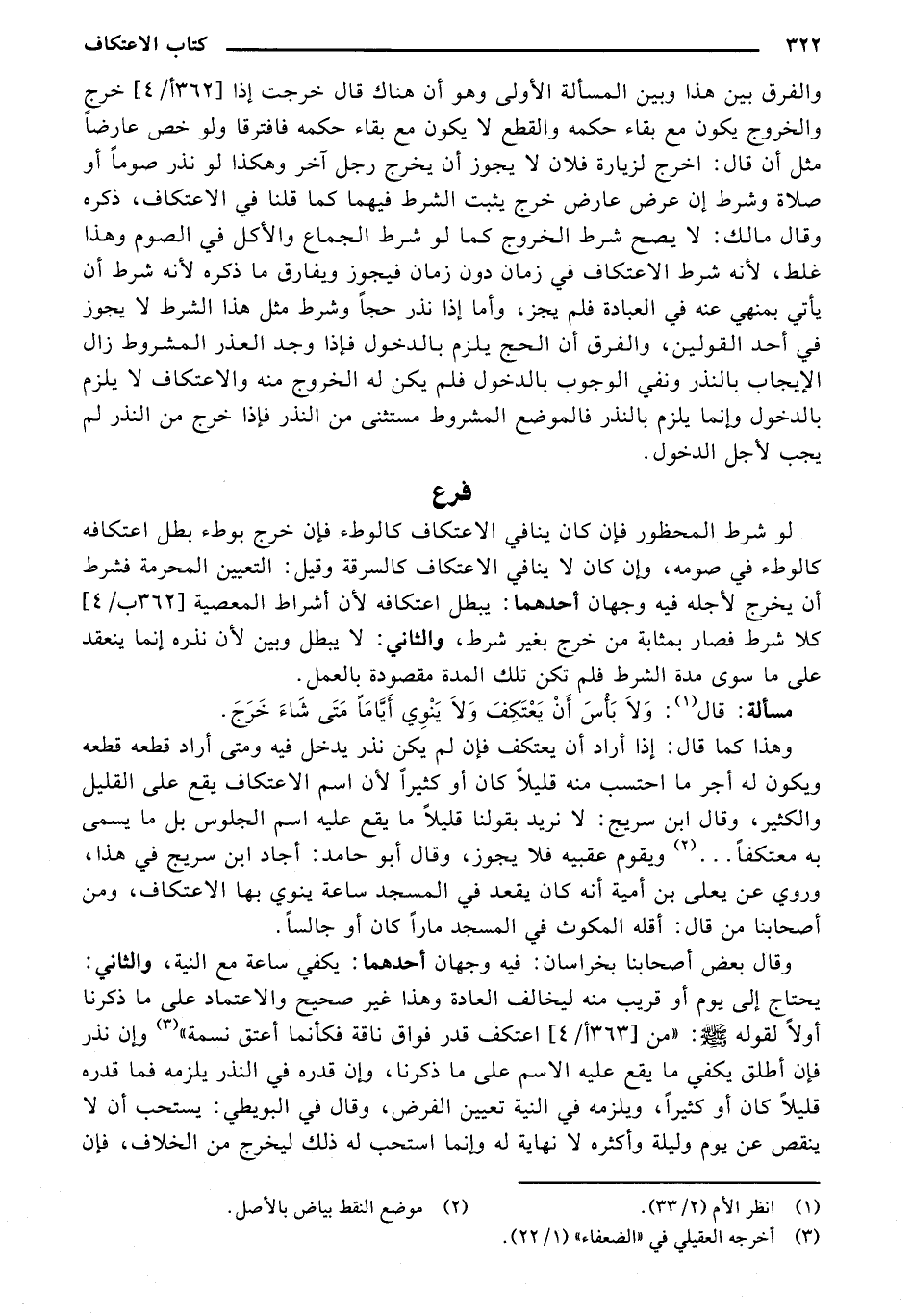 وهذا كما قال: إذا أراد أن يعتكف فإن لم يكن نذر يدخل فيه ومتى أراد قطعه قطعة ويكون له اجر ما احتسب منه قليلاً كان أو كثيرًا لأن اسم الاعتكاف يقع على القليل والكثير, وقال ابن سريج: لا نريد بقولنا قليلاً ما يقع عليه اسم الجلوس بل ما يسمى به معتكفًا ... (¬2) ويقوم عقبيه فلا يجوز, وقال أبو حامد: أجاد ابن سريج في هذا, وروي عن يعلى بن أمية أنه كان يقعد في المسجد ساعة ينوي بها الاعتكاف, ومن أصحابنا من قال: أقله المكوث في المسجد مارًا كان أو جالسًا.