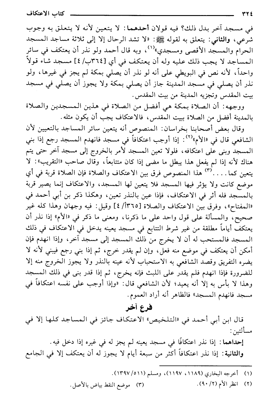 ووجهه: أن الصلاة بمكة هي أفضل من الصلاة في هذين المسجدين والصلاة بالمدينة أفضل من الصلاة ببيت المقدس, فالاعتكاف يجب أن يكون مثله.