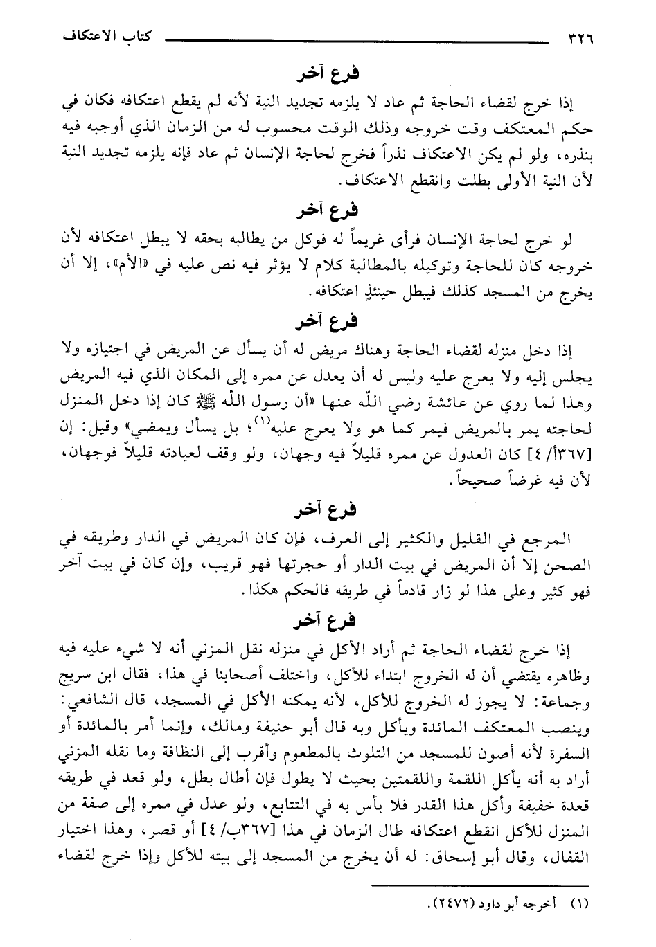 إذا خرج لقضاء الحاجة لقضاء الحاجة ثم عاد لا يلزمه تجديد النية لأنه لم يقطع اعتكافه فكان في حكم المعتكف وقت خروجه وذلك الوقت محسوب له من الزمان الذي أوجبه فيه بنذره, ولو لم يكن الاعتكاف نذرًا فخرج لحاجة الإنسان ثم عاد فإنه يلزمه تجديد النية لأن النية الأولى بطلت وانقطع الاعتكاف.