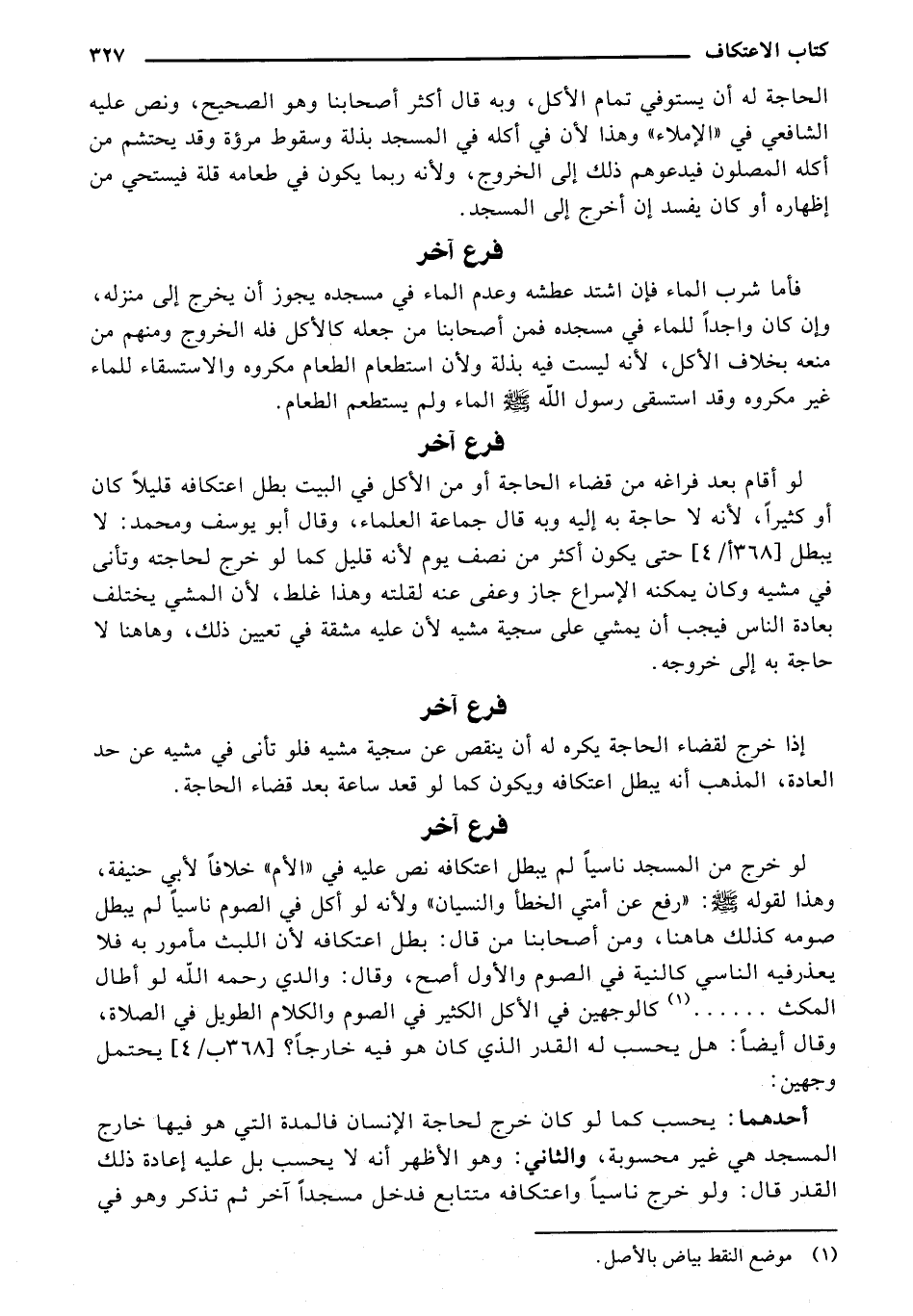 فأما شرب الماء فإن اشتد عطشه وعدم الماء في مسجده يجوز أن يخرج إلى منزله, وإن كان واجدًا للماء في مسجده فمن أصحابنا من جعله كالأكل فله الخروج ومنهم من منعه بخلاف الكل, لأنه ليست فيه بذلة ولأن استطعام الطعام مكروه والاستسقاء للماء غير مكروه وقد استسقى رسول الله صلى الله عليه وسلم الماء ولم يستطعم الطعام.