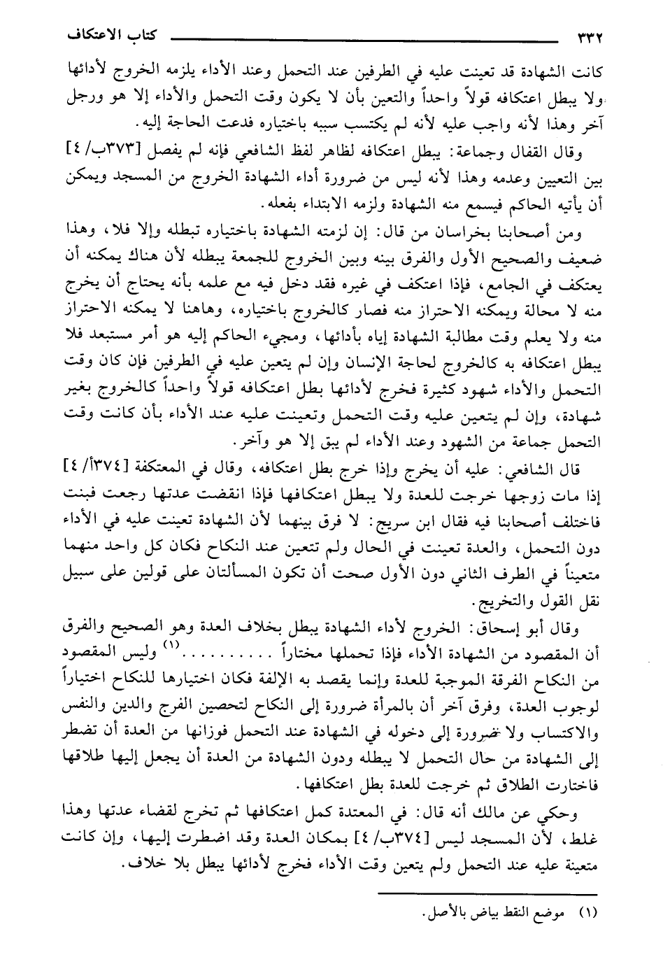 وقال أبو إسحاق: الخروج لأداء الشهادة يبطل بخلاف العدة وهو الصحيح والفرق أن المقصود من الشهادة الأداء فإذا تحملها مختارًا ............. (¬1) وليس المقصود من النكاح الفرقة الموجبة للعدة وإنما يقصد به الإلفة فكان اختيارها للنكاح اختيارًا لوجوب العدة, وفرق آخر أن بالمرأة ضرورة إلى النكاح لتحصين الفرج والدين والنفس والاكتساب ولا ضرورة إلى دخوله في الشهادة عند التحمل فوزانها من العدة أن تضطر إلى الشهادة من حال التحمل لا يبطله ودون الشهادة من أن يجعل إليها طلاقها فاختارت الطلاق ثم خرجت للعدة بطل اعتكافها.