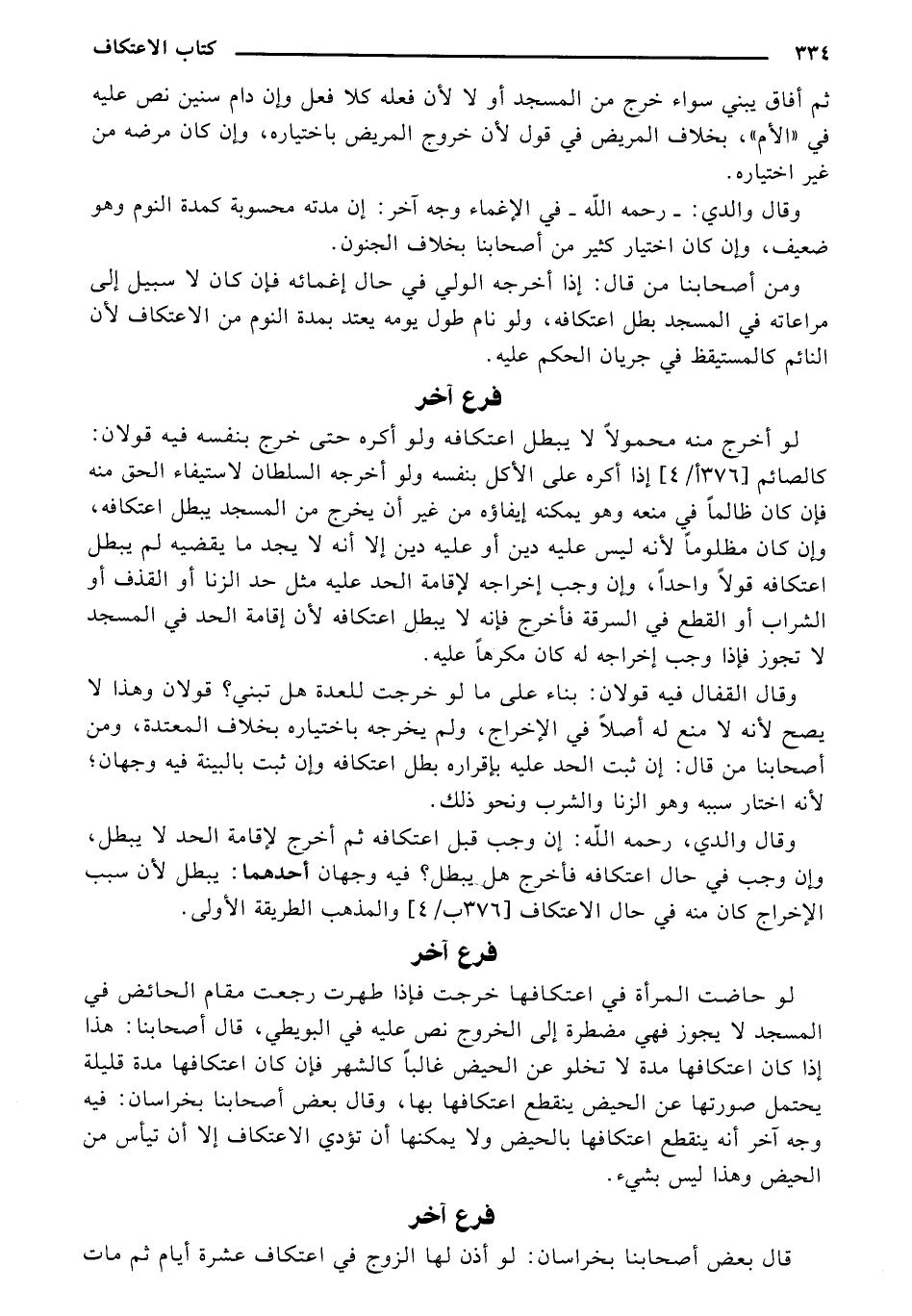 وقال والدي, رحمه الله: إن وجب قبل اعتكافه ثم أخرج لإقامة الحد لا يبطل, وإن وجب في حال اعتكافه فاخرج هل يبطل؟ فيه وجهان أحدهما: يبطل لأن سبب الإخراج كان منه في حال الاعتكاف [376 ب/4] والمذهب الطريقة الأولى.