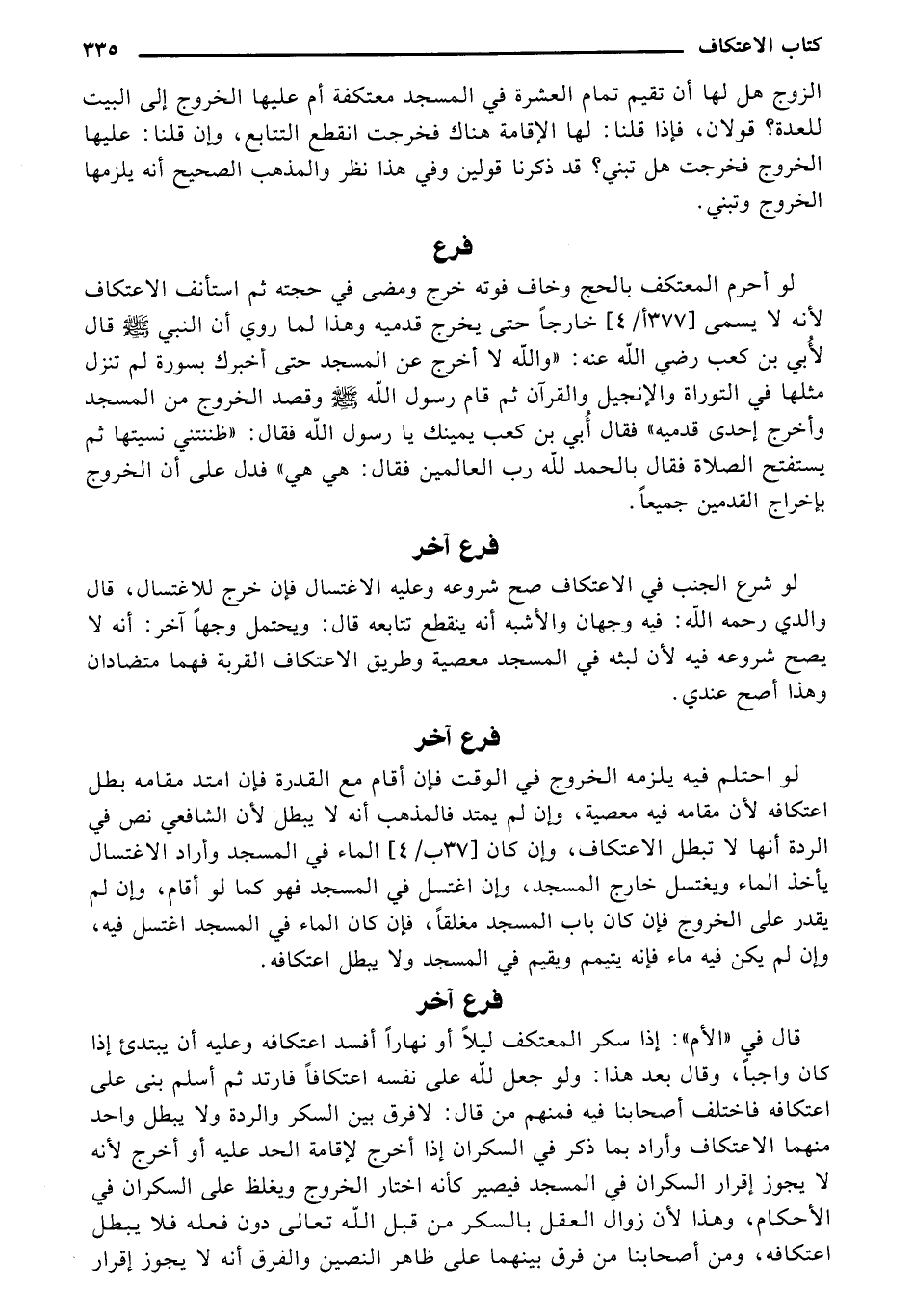 لو أحرم المعتكف بالحج وخاف فوته خرج ومضى في حجته ثم استأنف الاعتكاف لأنه لا يسمى [377 أ/ 4] خارجًا حتى يخرج قدميه وهذا لما روي أن النبي صلى الله عليه وسلم قال لأبي بن كعب رضي الله عنه: "والله لا أخرج عن المسجد حتى أخبرك بسورة لم تنزل مثلها في التوراة والإنجيل والقرآن ثم قام رسول الله صلى الله عليه وسلم وقصد الخروج من المسجد وأخرج إحدى قدميه" فقال أبي بن كعب يمينك يا رسول الله فقال: "ظننتني نسيتها ثم يستفتح الصلاة فقال بالحمد لله رب العالمين فقال: هي هي " فدل على أن الخروج بإخراج القدمين جميعًا.