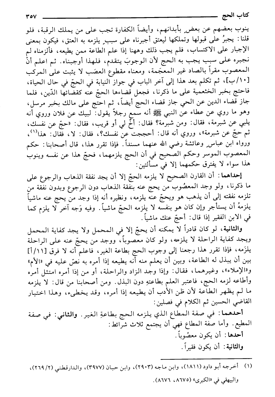 ينوب بعضهم عن بعضٍ بأبدانهم، وأيضًا الكفارة تجب على من يملك الرقبة، فلو قلنا: يجبرُ على قبولها وتملكها ليعتق أجبرناه على سببٍ يلزمه به العتق، فيكون بمعنى الإجبار على الاكتساب، فلم يجب ذلك وههنا إذا علم الطاعة ممن يطيعه، فألزمنا لم تجبره على سبب يجب به الحج لأن الوجوبَ يتقدم، فلهذا أوجبناه. نم اعلم أنَّ المعصوب مقرًا بالصاد غير المعجَمة، ومعناه مقطوع العصَب لا يثبت على المركب [10/ب]،ثم تكلم بعد هذا إلى آخر الباب في جواز النيابة في الحجّ في حال الحياة، فاحتج بخبر الخثعمية على ما ذكرنا، فجعل قضاءها الحجّ عنه كقضائها الدّين، فلما جاز قضاء الدين عن الحي جاز محاء الحج أيضًا، ثم احتج على مالك بخبر مرسل، وهو ما روي عن عطاء عن النبي (صلي الله عليه وسلم) أنه سمع رجلًا يقول: لبيك عن فلان وروي أنه يلبي عن شبرمة، فقال: ومن شبرمة؟ فقال: أخٌ لي أو قريب، فقال: "حجّ عن نفسك، ثم حجّ عن شبرمة"، وروي أنه قال: أحججت عن نفسك؟، فقال: لا، فقال: هذا (¬1)، ورواه ابن عباسٍ وعائشة رضي الله عنهما مسندًا. فإذا تقرر هذا، قال أصحابنا: حكم المعصوب الموسر وحكم الصحيح في أن الحج يلزمهما، فحجّ هذا عن نفسه وينوب هذا سواء لا يفترق حكمهما إلا في مسألتين: