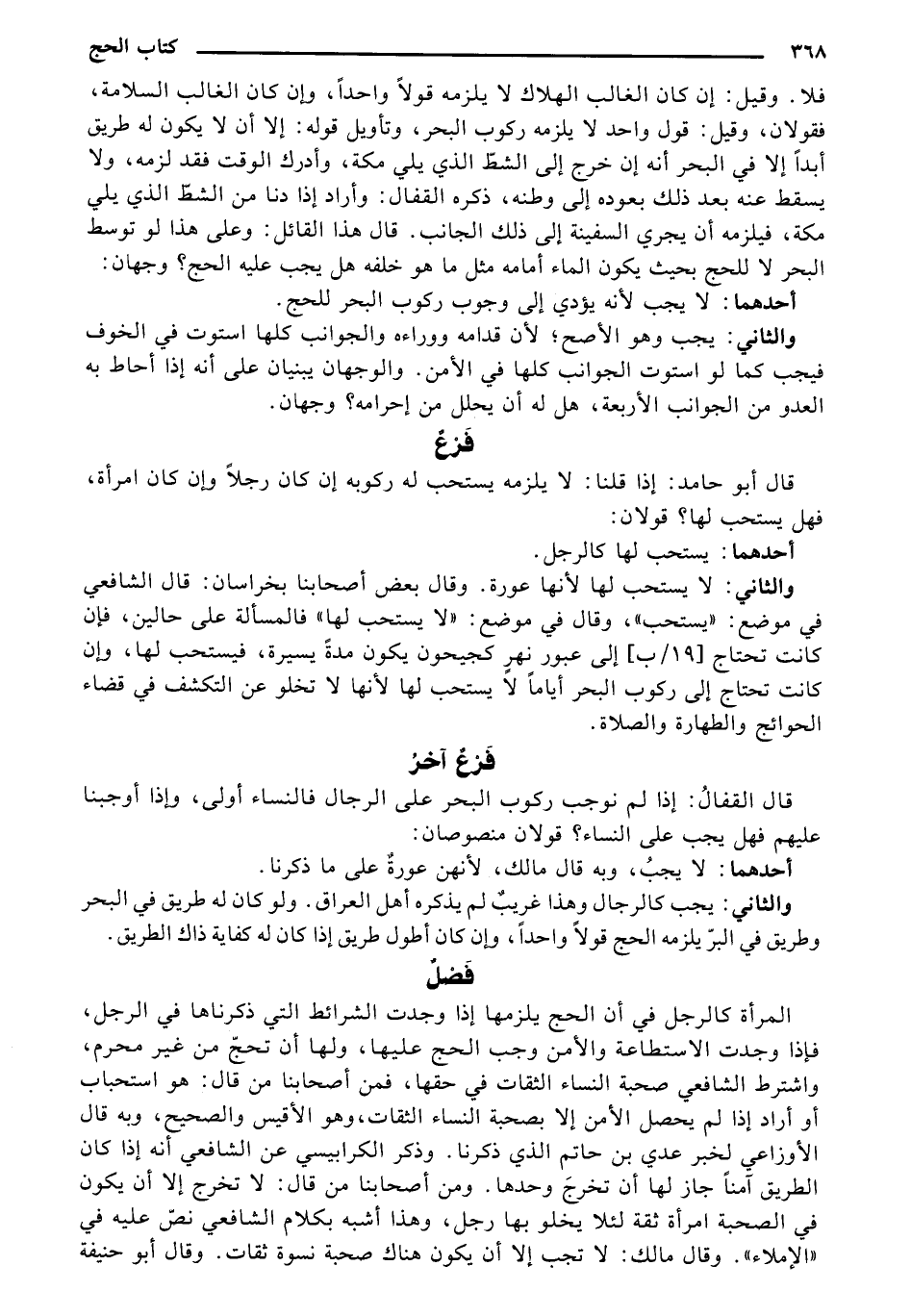 الثاني: لا يستحب لها لأنها عورة. وقال بعض أصحابنا بخراسان: قال الشافعي في موضع: «يستحب»، وقال في موضع: «لا يستحب لها» فالمسألة على حالين، فإن كانت تحتاج [19/ ب] إلى عبور نهرٍ كجيحون يكون مدةً يسيرة، فيستحب لها، وإن كانت تحتاج إلى ركوب البحر أيامًا لا يستحب لها لأنها لا تخلو عن التكشف في قضاء الحوائج والطهارة والصلاة.