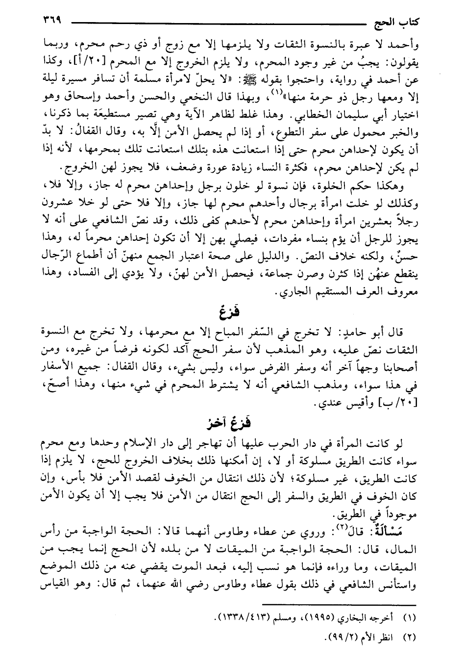 قال أبو حامدٍ: لا تخرج في السّفر المباح إلا مع محرمها، ولا تخرج مع النسوة الثقات نصّ عليه، وهو المذهب لأن سفر الحج آكد لكونه فرضًا من غيره، ومن أصحابنا وجهًا آخر أنه وسفر الفرض سواء، وليس بشيء، وقال القفال: جميع الأسفار في هذا سواء، ومذهب الشافعي أنه لا يشترط المحرم في شيء منها، وهذا أصحّ، [20/ ب] وأقيس عندي.
