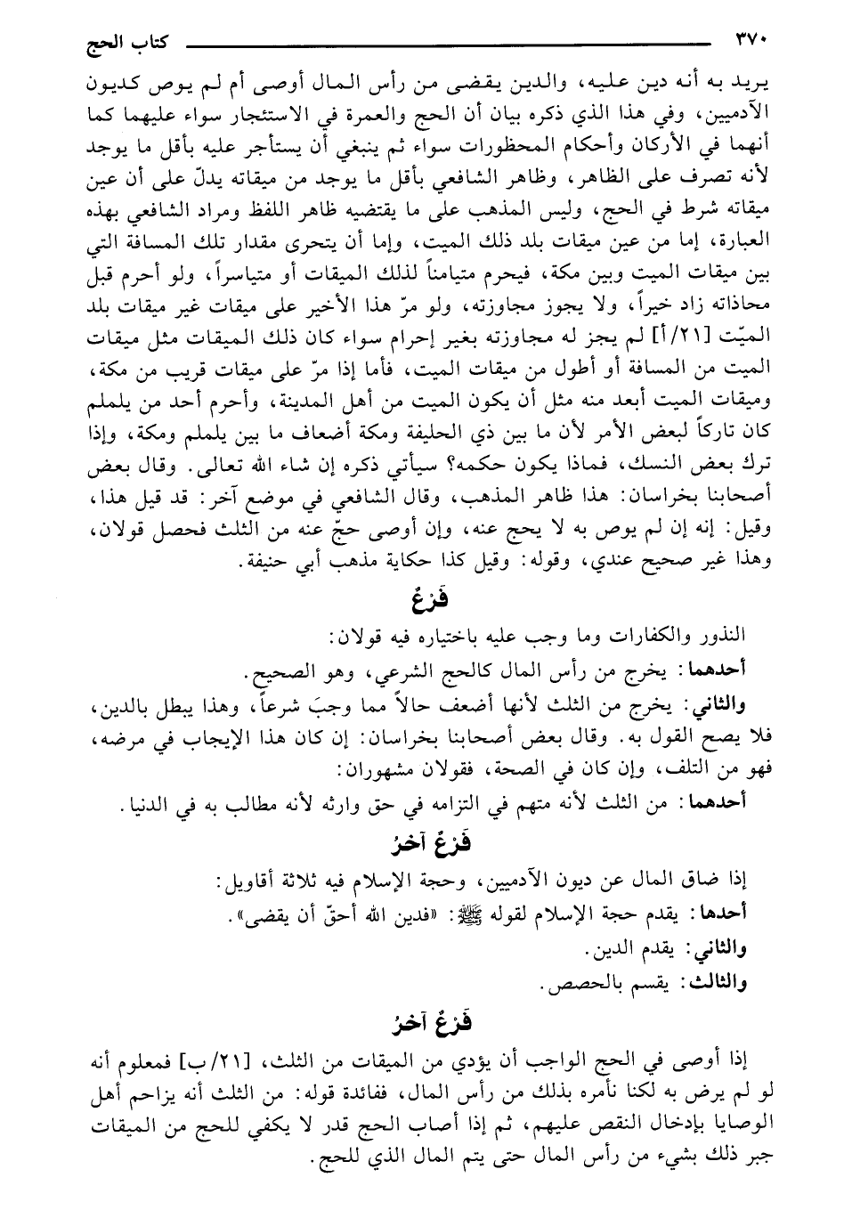 يريد به أنه دين عليه، والدين يقضى من رأس المال أوصى أم لم يوص كديون الآدميين، وفي هذا الذي ذكره بيان أن الحج والعمرة في الاستئجار سواء عليهما كما أنهما في الأركان وأحكام المحظورات سواء ثم ينبغي أن يستأجر عليه بأقل ما يوجد لأنه تصرف على الظاهر، وظاهر الشافعي بأقل ما يوجد من ميقاته يدلّ على أن عين ميقاته شرط في الحج، وليس المذهب على ما يقتضيه ظاهر اللفظ ومراد الشافعي بهذه العبارة، إما من عين ميقات بلد ذلك الميت، وإما أن يتحرى مقدار تلك المسافة التي بين ميقات الميت وبين مكة، فيحرم متيامنًا لذلك الميقات أو متياسرًا، ولو أحرم قبل محاذاته زاد خيرًا، ولا يجوز مجاوزته، ولو مرّ هذا الأخير على ميقات غير ميقات بلد الميّت [21/ أ] لم يجز له مجاوزته بغير إحرام سواء كان ذلك الميقات مثل ميقات الميت من المسافة أو أطول من ميقات الميت، فأما إذا مرّ على ميقات قريب من مكة، وميقات الميت أبعد منه مثل أن يكون الميت من أهل المدينة، وأحرم أحد من يلملم كان تاركًا لبعض الأمر لأن ما بين ذي الحليفة ومكة أضعاف ما بين يلملم ومكة، وإذا ترك بعض النسك، فماذا يكون حكمه؟ سيأتي ذكره إن شاء الله تعالى. وقال بعض أصحابنا بخراسان: هذا ظاهر المذهب، وقال الشافعي في موضع آخر: قد قيل هذا، وقيل: إنه إن لم يوص به لا يحج عنه، وإن أوصى حجّ عنه من الثلث فحصل قولان، وهذا غير صحيح عندي، وقوله: وقيل كذا حكاية مذهب أبي حنيفة.