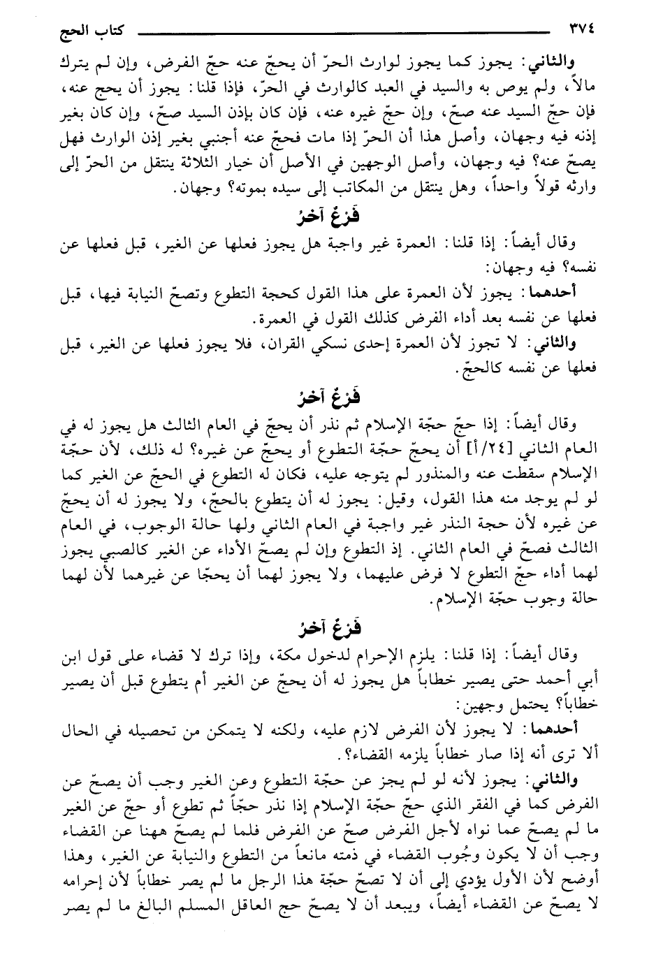 والثاني: يجوز لأنه لو لم يجز عن حجة التطوع وعن الغير وجب أن يصح عن الفرض كما في الفقر الذي حج حجة الإسلام إذا نذر حجاً ثم تطوع أو حج عن الغير ما لم يصح عما نواه لأجل الفرض صح عن الفرض فلما لم يصح ههنا عن القضاء وجب أن لا يكون وجوب القضاء في ذمته مانعاً من التطوع والنيابة عن الغير، وهذا أوضح لأن الأول يؤدي إلى أن لا تصح حجة هذا الرجل ما لم يصر خطاباً لأن إحرامه لا يصح عن القضاء أيضاً، ويبعد أن لا يصح حج العاقل المسلم البالغ ما لم يصر.