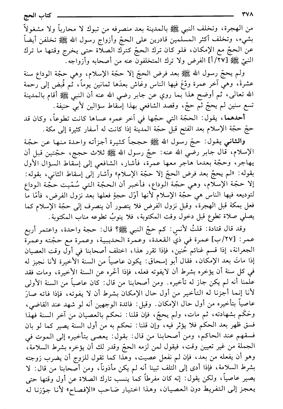 من الهجرة، وتخلف النبي صلى الله عليه وسلم بالمدينة بعد منصرفه من تبوك لا محارباً ولا مشغولاً بشيء، وتخلف أكثر المسلمين قادرين على الحج وأزواج رسول الله صلى الله عليه وسلم تخلفن أيضاً عن الحج مع الإمكان، فلو كان ترك الحج كترك الصلاة حتى يخرج وقتها ما ترك النبي صلى الله عليه وسلم [27/أ] الفرض ولا ترك المتخلفون عنه من أصحابه وأزواجه.
