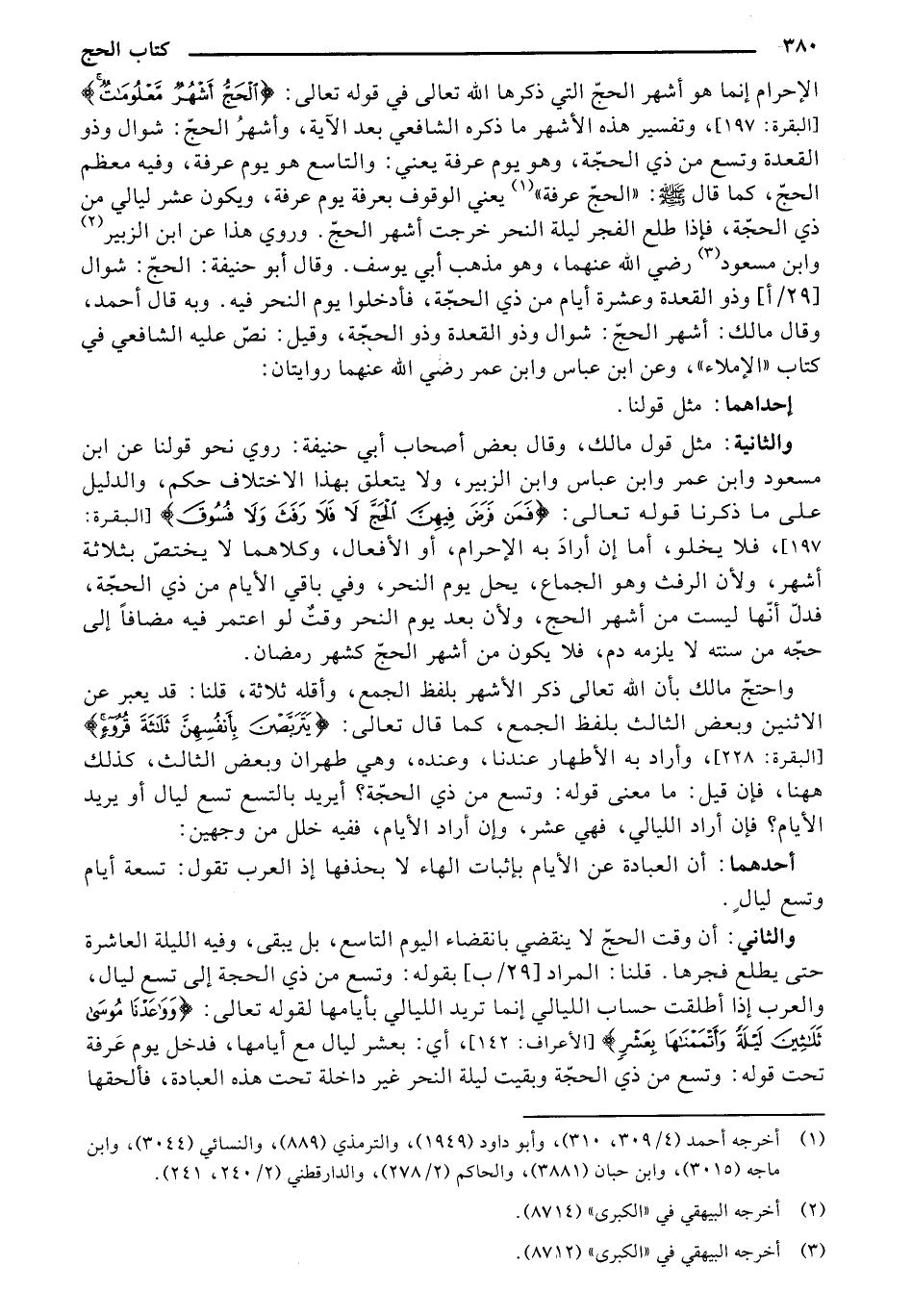 والثانية: مثل قول مالك، وقال بعض أصحاب أبي حنيفة: روي نحو قولنا عن أبن مسعود وابن عمر وابن عباس وابن الزبير، ولا يتعلق بهذا الاختلاف حكم، والدليل على ما ذكرنا قوله تعالى: {فَمَن فَرَضَ فِيهِنَّ الحَجَّ فَلا رَفَثَ ولا فُسُوقَ} [البقرة: 197]، فلا يخلو، أما إن أراد به الإحرام، أو الأفعال، وكلاهما لا يختص بثلاثة أشهر، ولأن الرفث وهو الجماع، يحل يوم النحر، وفي باقي الأيام من ذي الحجة، فدل أنها ليست من أشهر الحج، ولأن بعد يوم النحر وقت لو اعتمر فيه مضافاً إلى حجة من سنته لا يلزمه دم، فلا يكون من أشهر الحج كشهر رمضان.