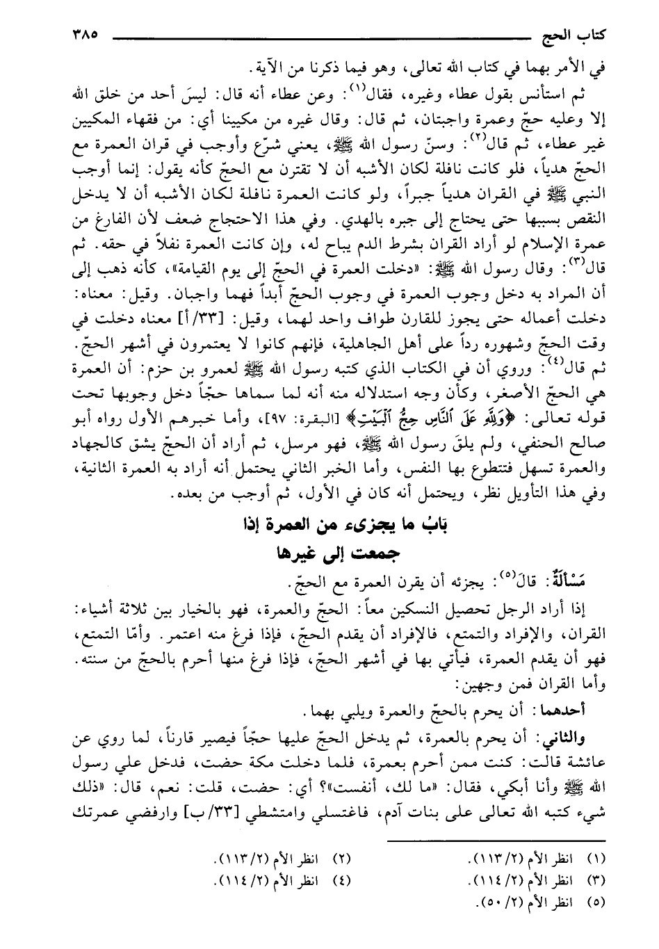 إذا أراد الرجل تحصيل النسكين معاً: الحج والعمرة، فهو بالخيار بين ثلاثة أشياء: القران، والإفراد والتمتع، فالإفراد أن يقدم الحج، فإذا فرغ منه اعتمر. وأما التمتع، فهو أن يقدم العمرة، فيأتي بها في أشهر الحج، فإذا فرغ منها أحرم بالحج من سنته. وأما القران فمن وجهين: